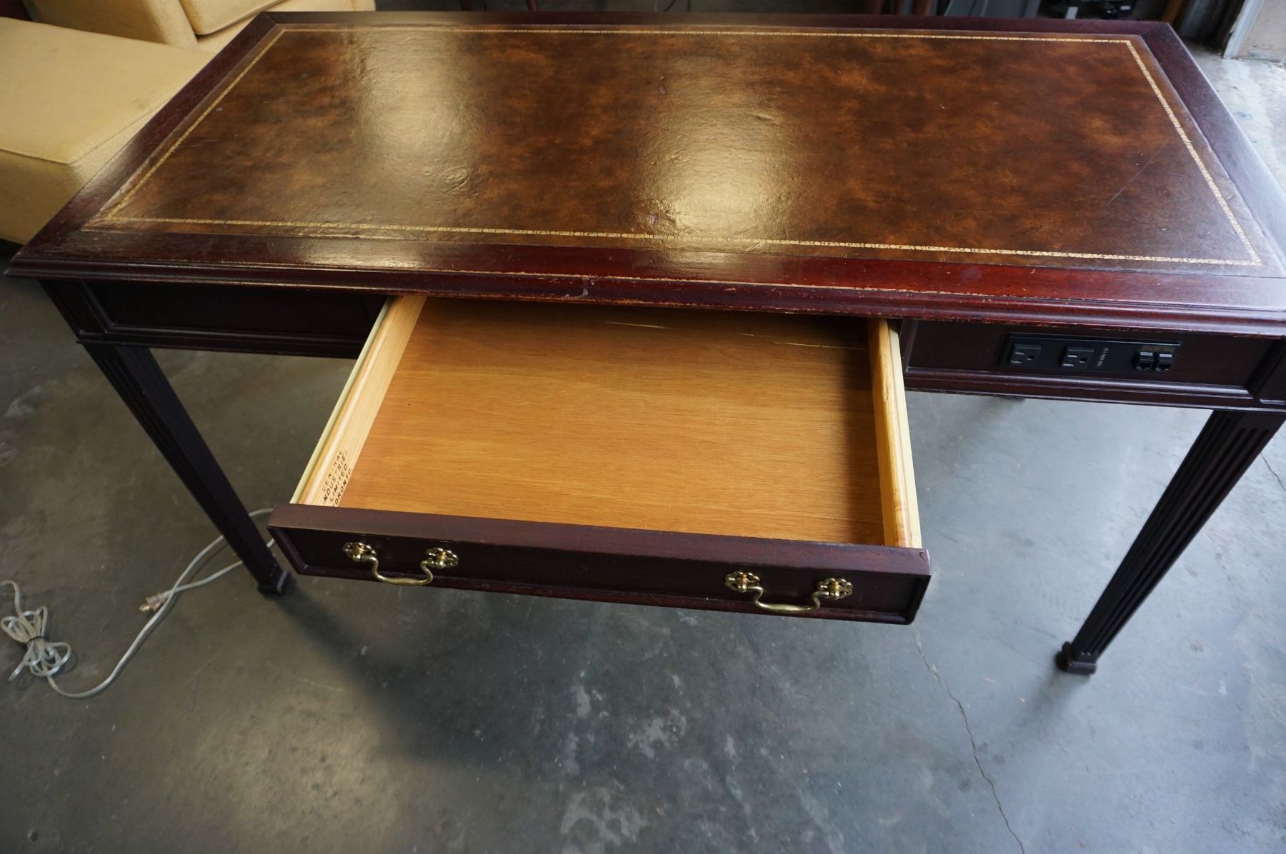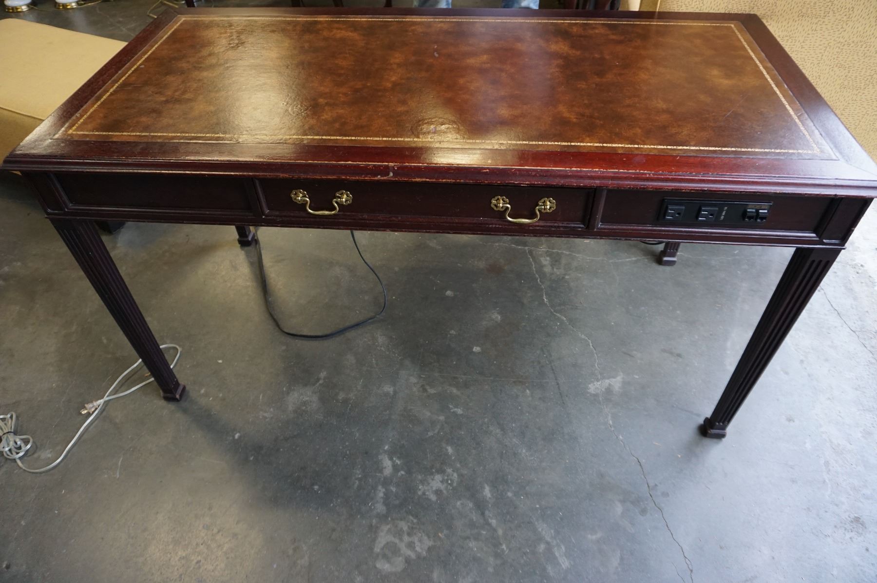MAHOGANY OPEN DESK WITH LEATHER TOP AND POWER OUTLETS