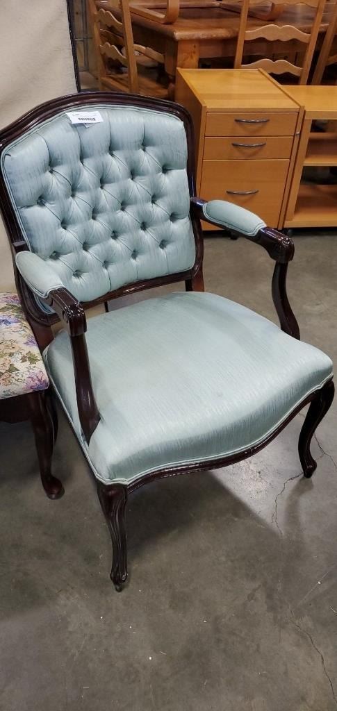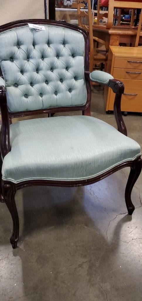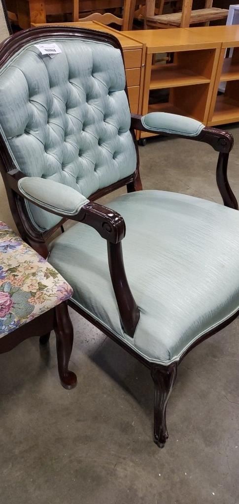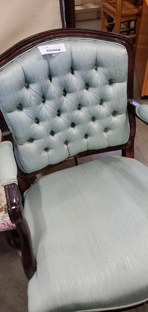 MAHOGANY QUEEN ANNE BENT LEG CHAIR W/ GREEN TUFTED FABRIC