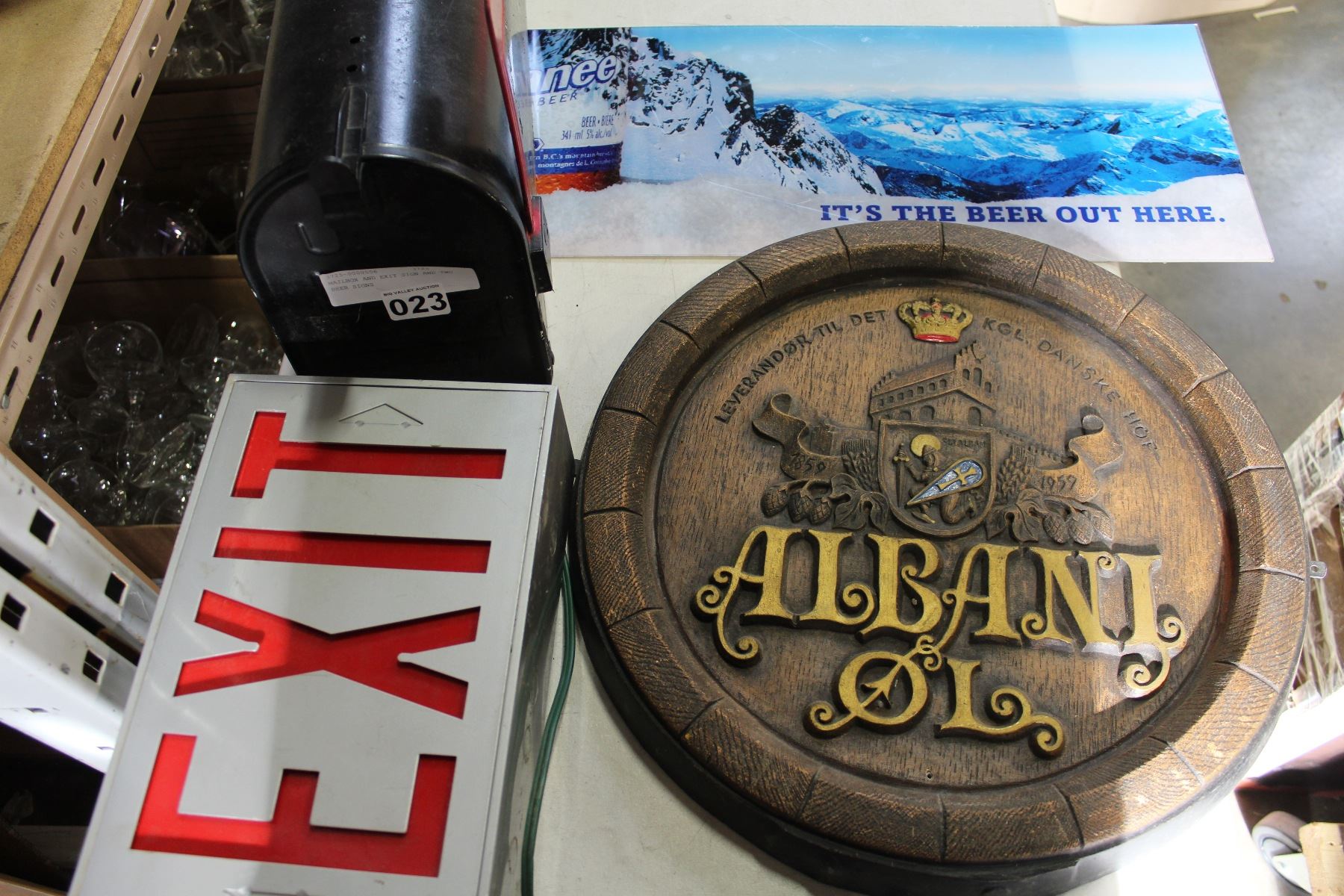 MAILBOX AND EXIT SIGN AND TWO BEER SIGNS