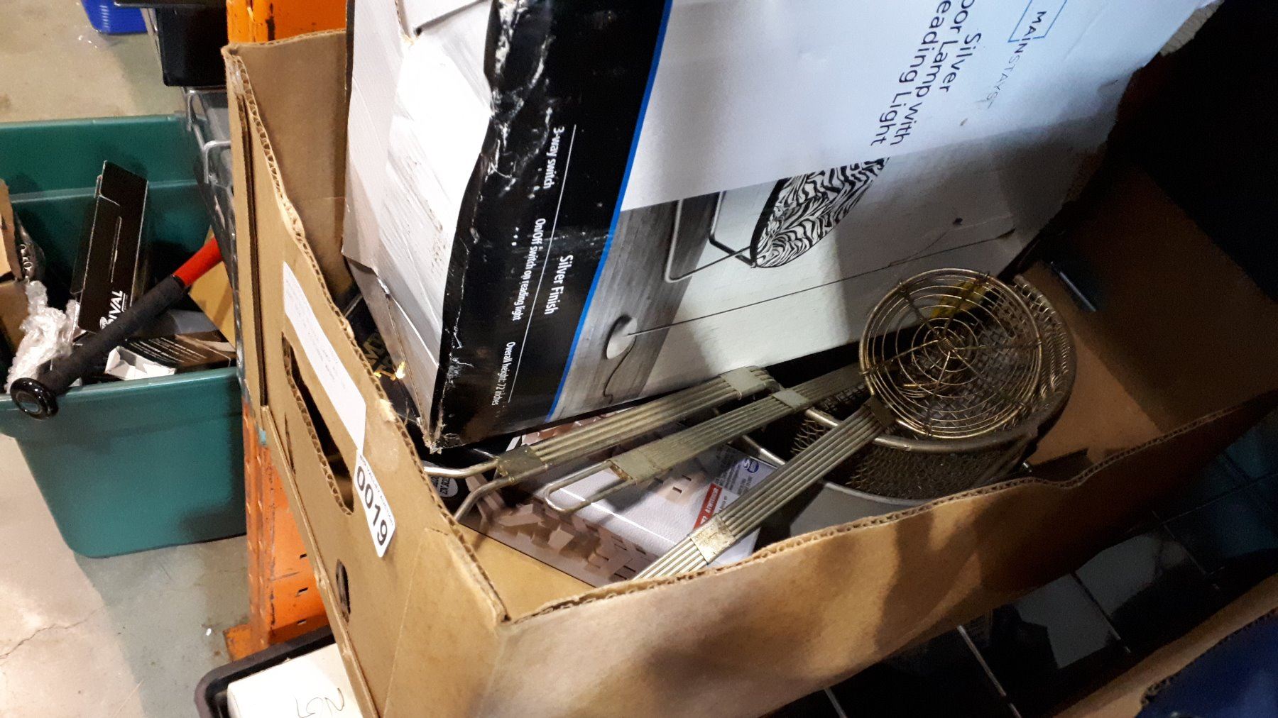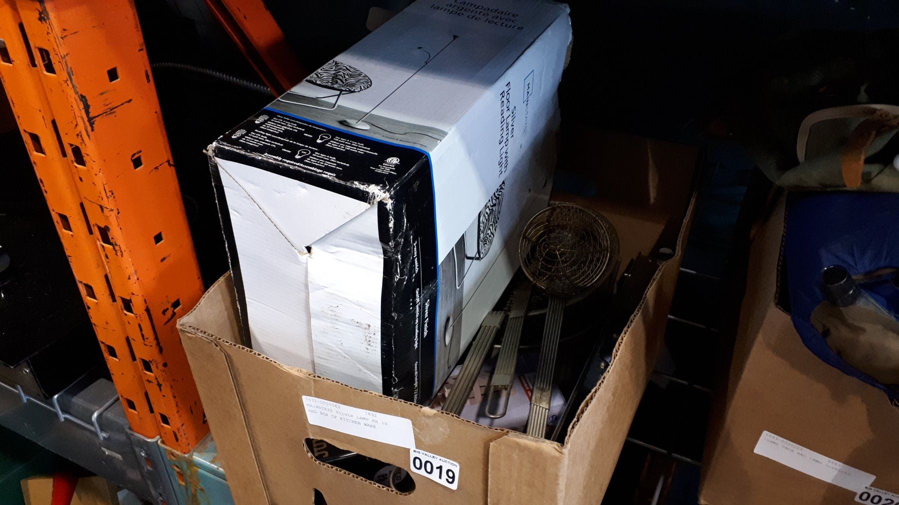 MAINSTAYS SILVER LAMP AS IS AND BOX OF KITCHEN WARE