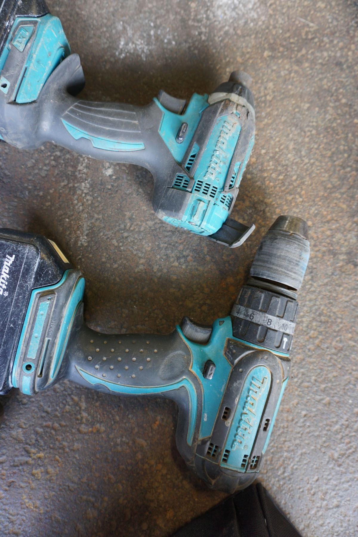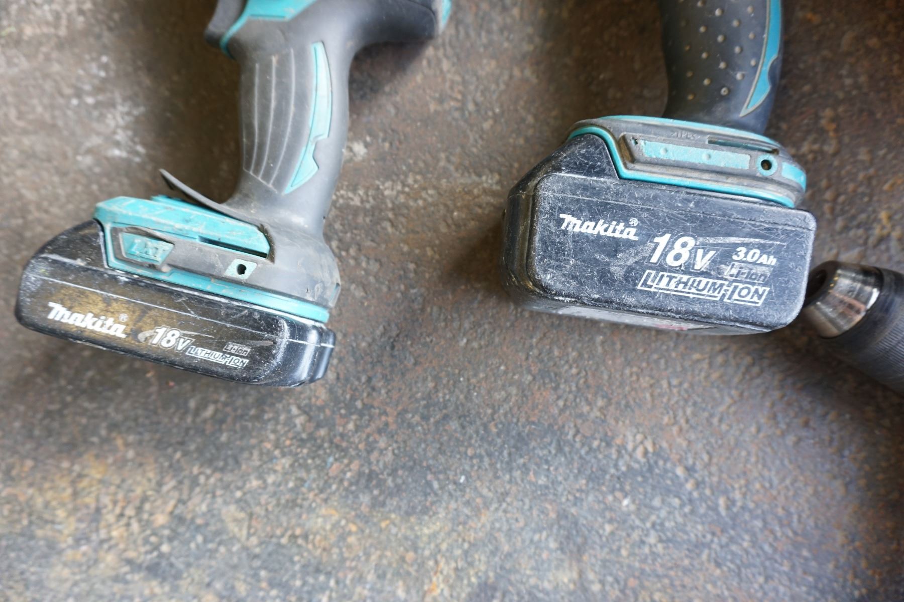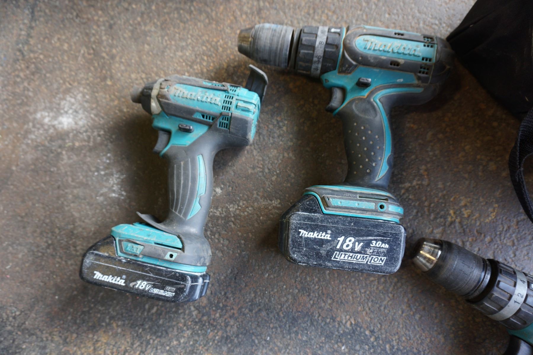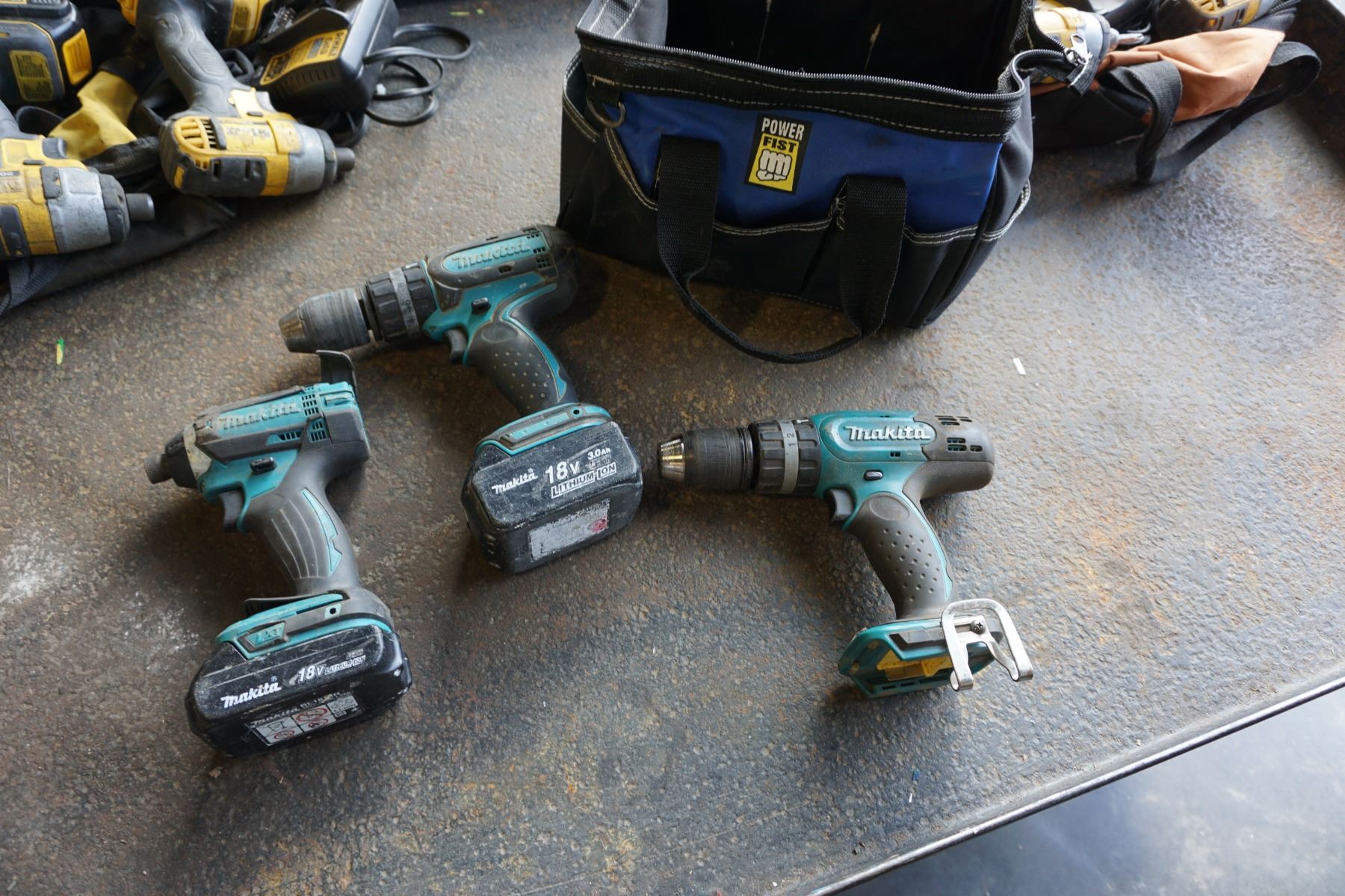 MAKITA 18V LITHIUM IMPACT GUN, 2 HAMMER DRILLS, AND 2 18V BATTERIES - TESTED WORKING