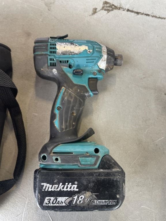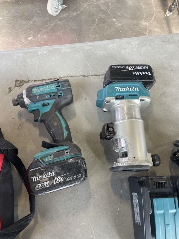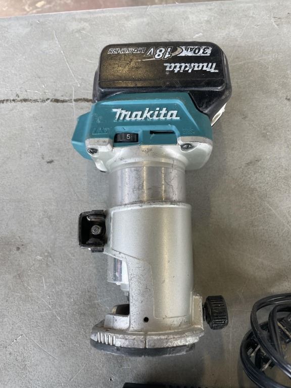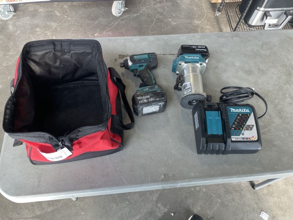 MAKITA CORDLESS 18V DRT50 ROUTER, AND IMPACT GUN, 2 3.0AH BATTERIES, CHARGER AND CARRY BAG, ALL TESTED WORKING