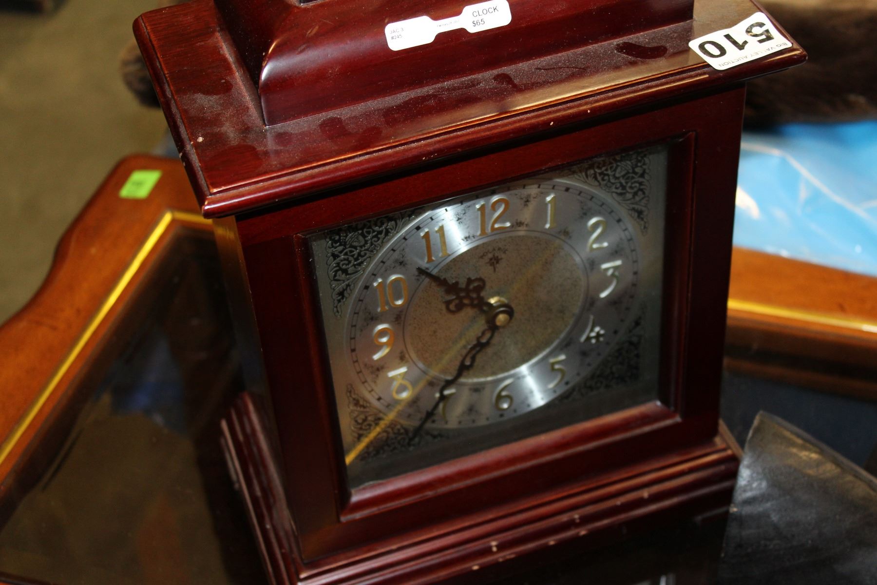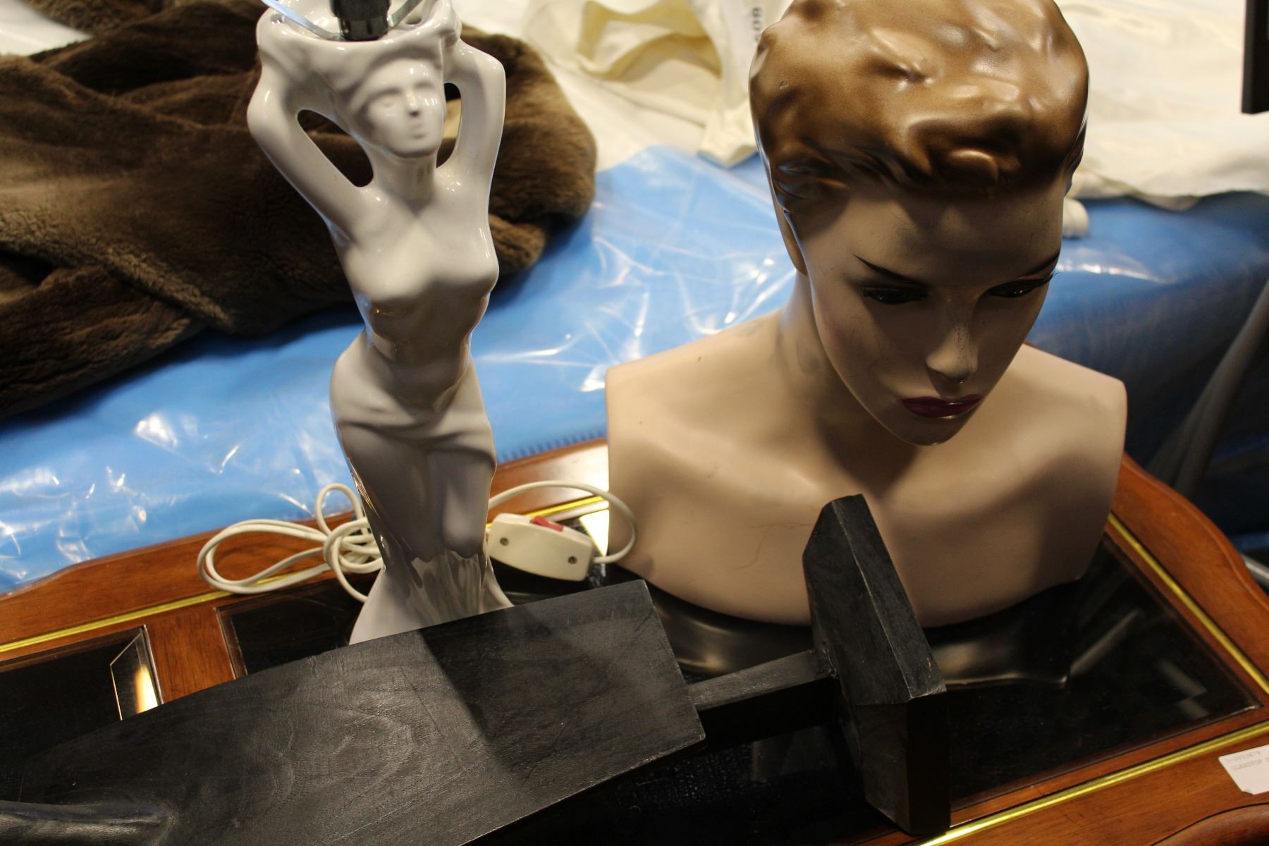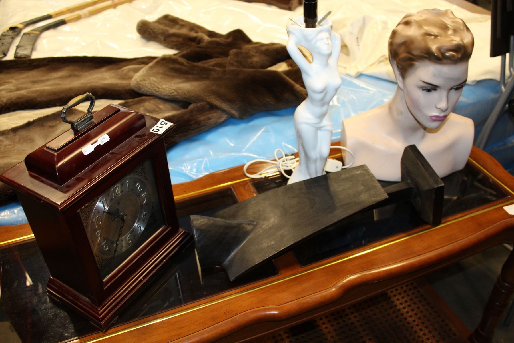 MANTLE CLOCK, MANEQUIN HEAD AND LAMP