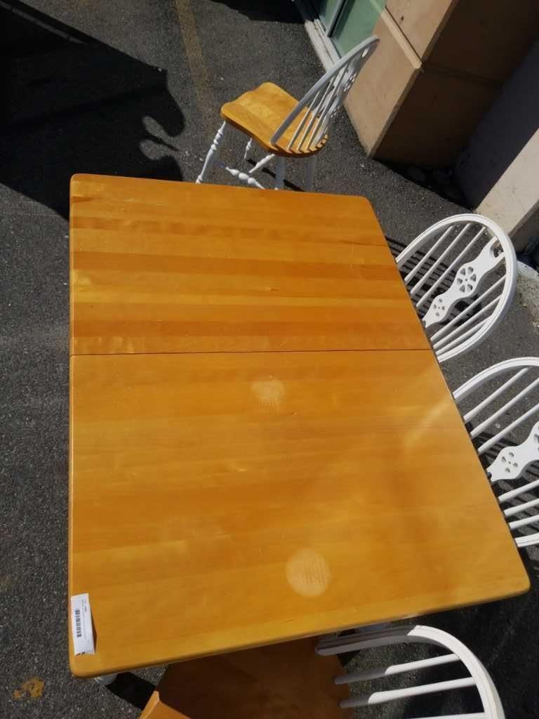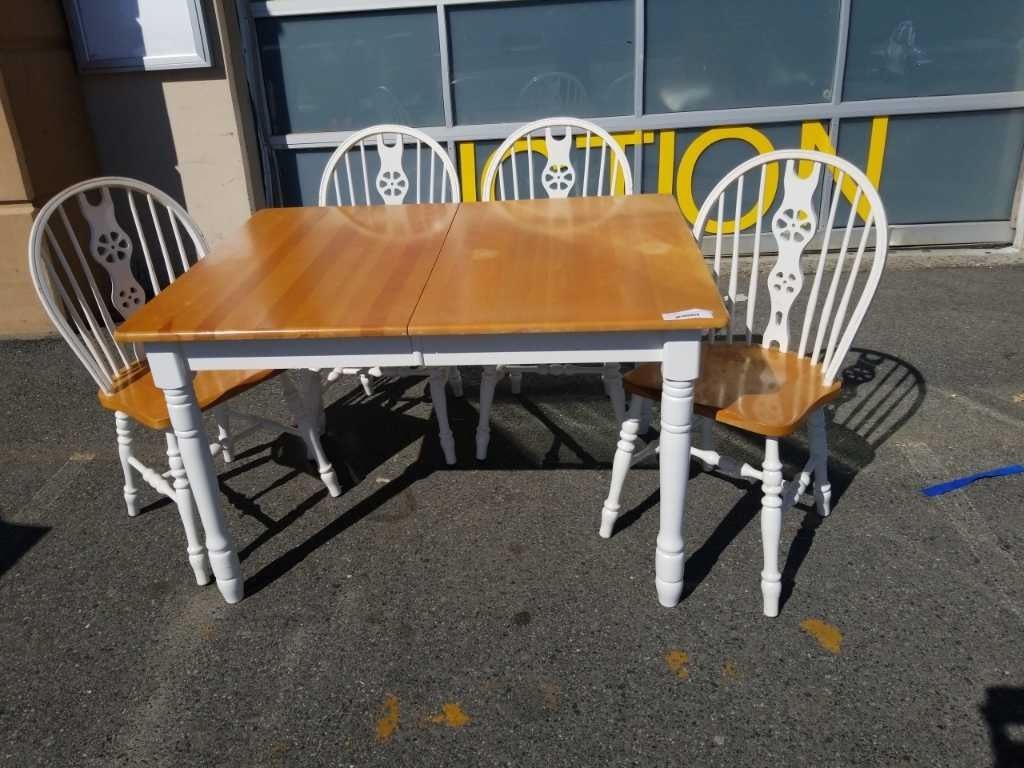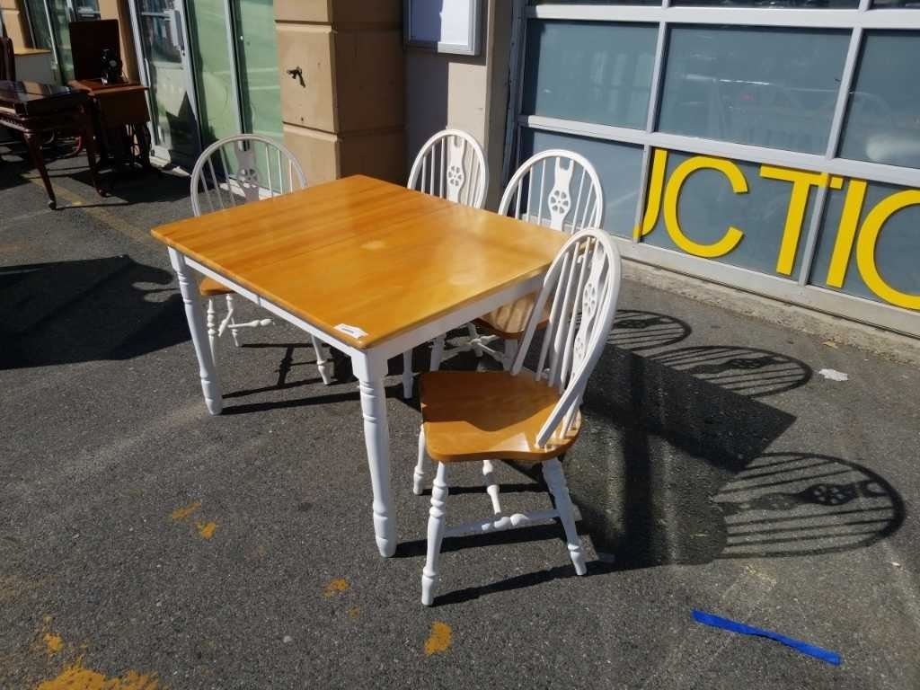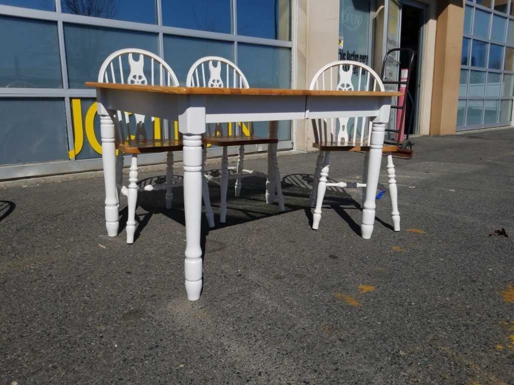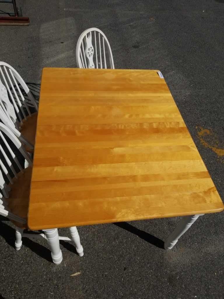 MAPLE AND WHITE DINING TABLE WITH LEAF AND 4 CHAIRS - 4 X 3 FOOT X 29 INCHES TALL WITH 12 INCH LEAF