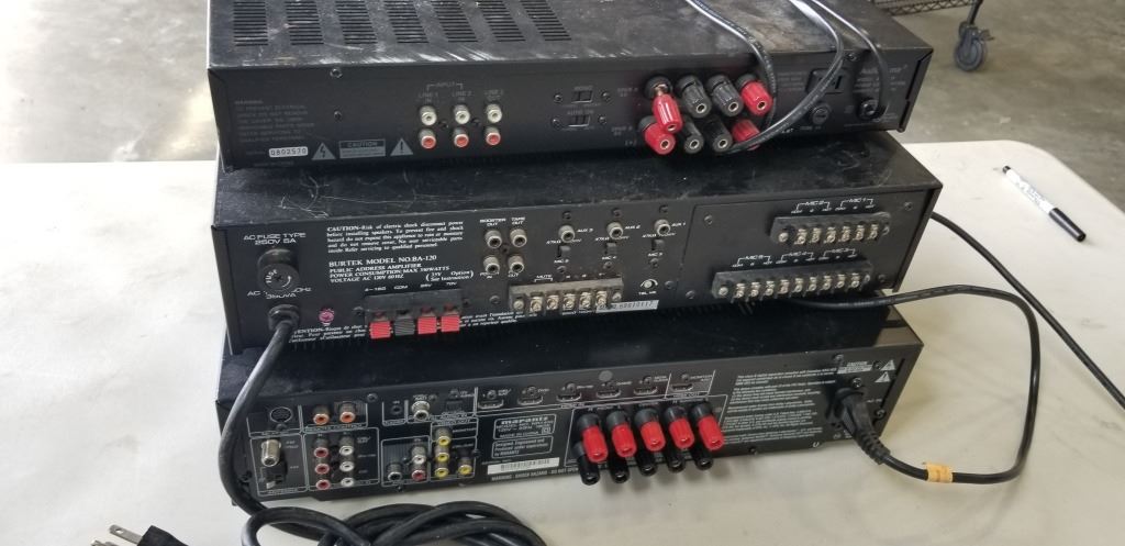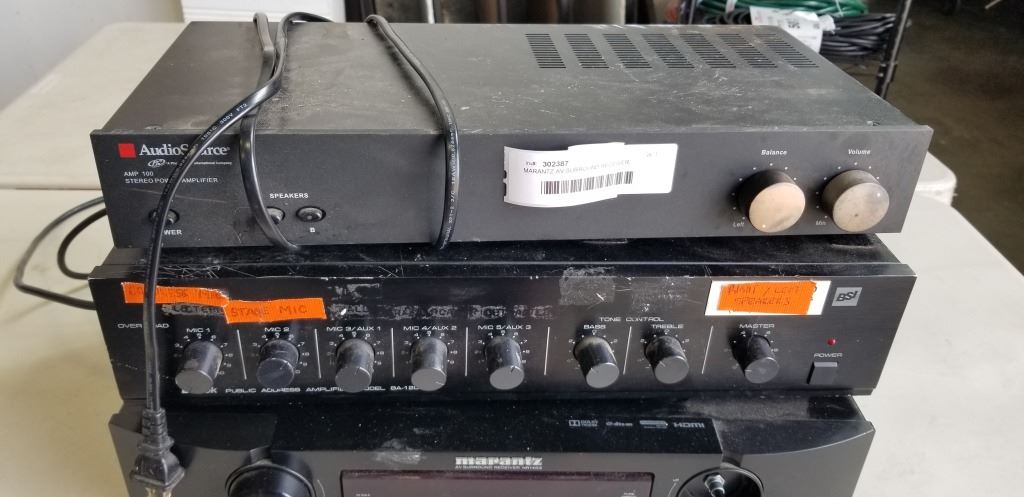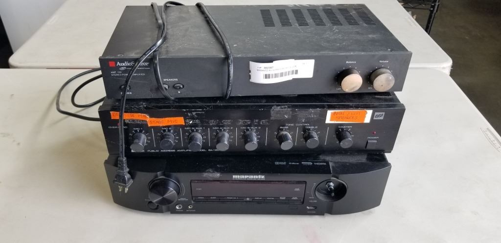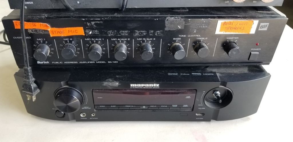 MARANTZ AV SURROUND RECEIVER, MODEL NR1403 WORKING BUT MISSING ONE KNOB, AND AUDIO SOURCE STEREO AMPLIFIER AND BURTEK PUBLIC ADDRESS AMPLIFIER
