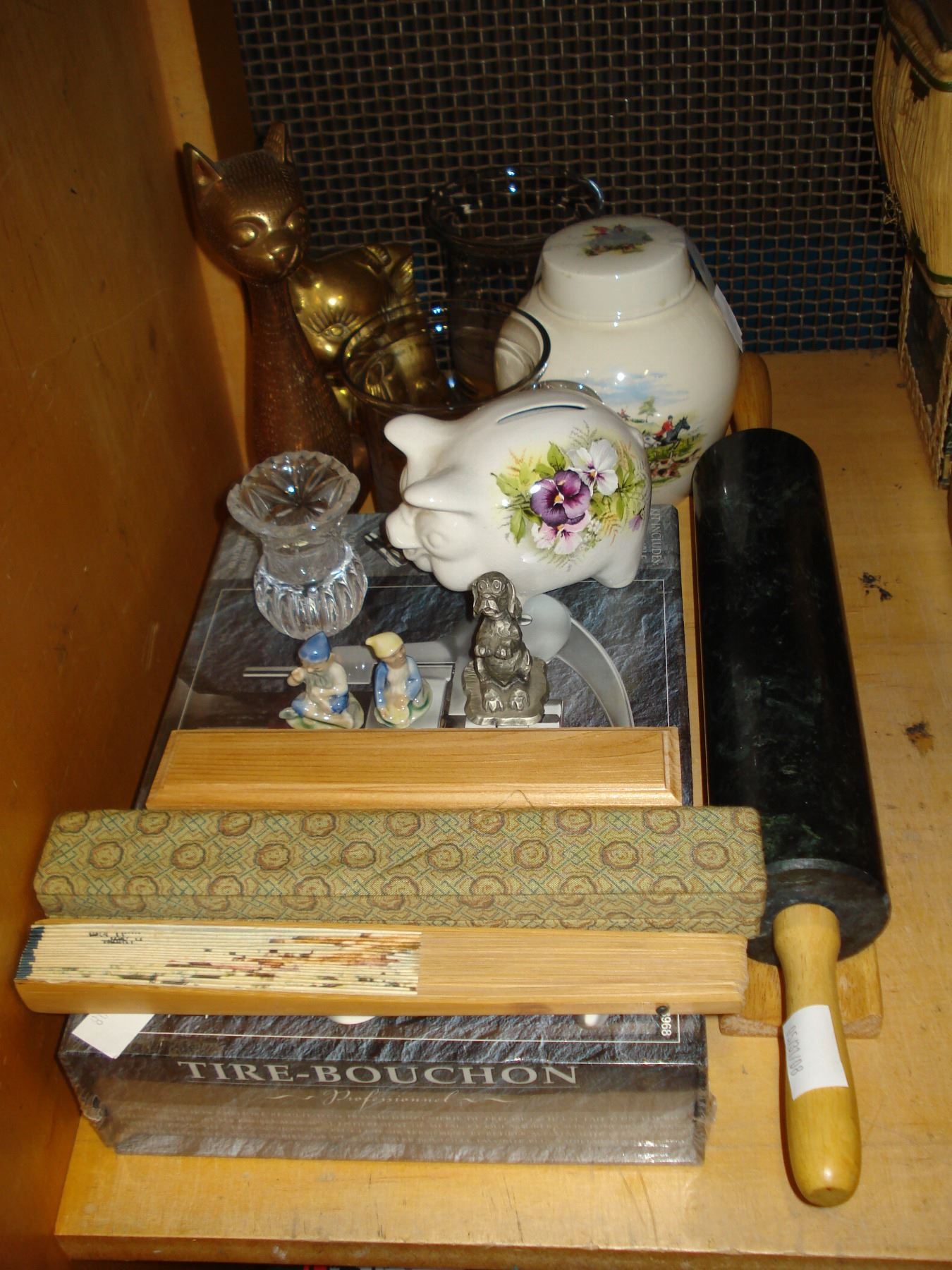 MARBLE ROLLING PIN, METAL CATS, AND SHIP GLASSES AND PIGGY BANK AND JAR