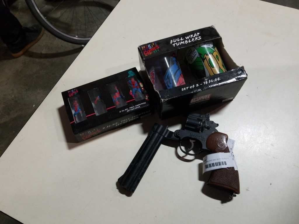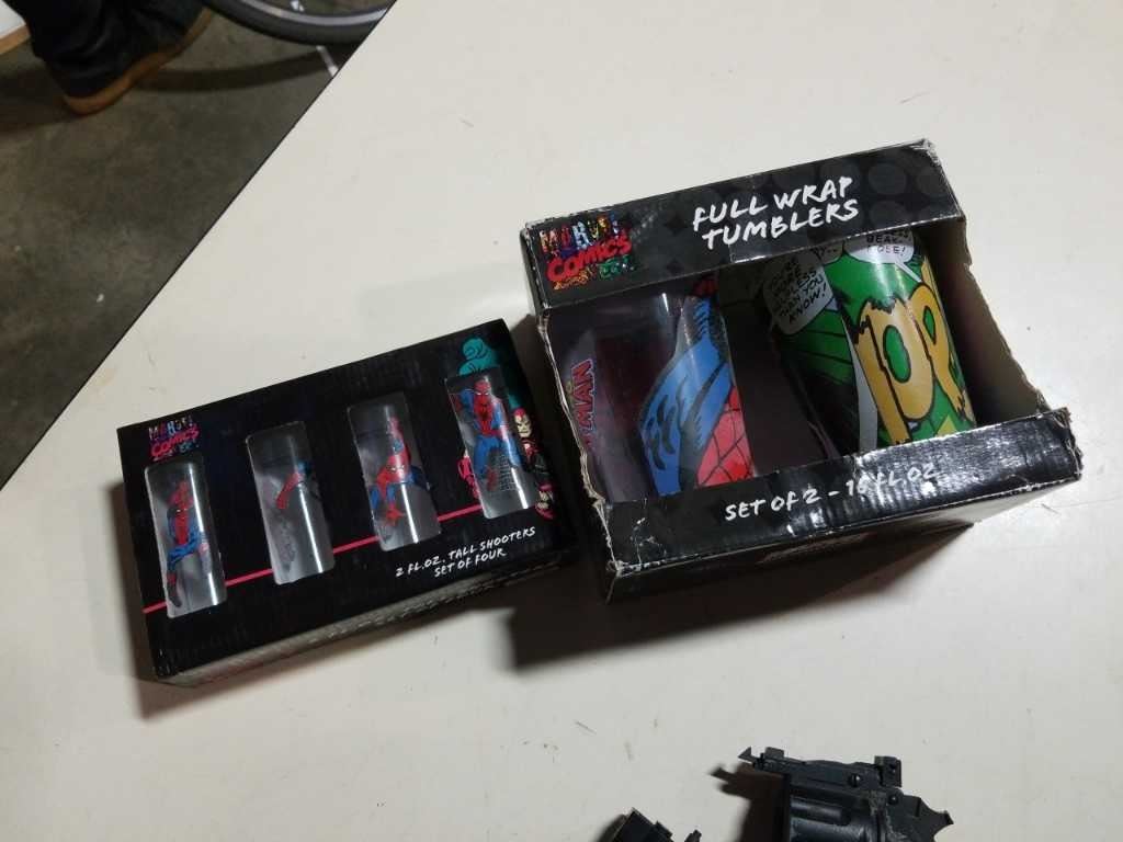 MARVEL TUMBLERS AND SHOT GLASSES AND PELLET PISTOL NO CHAMBER