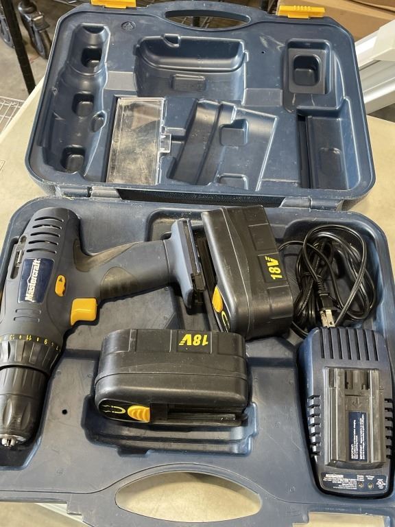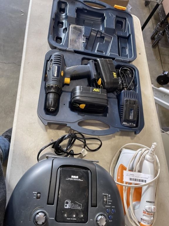 MASTER CRAFT 18V DRILL AND CHARGER SET, IRON AND RCA STEREO