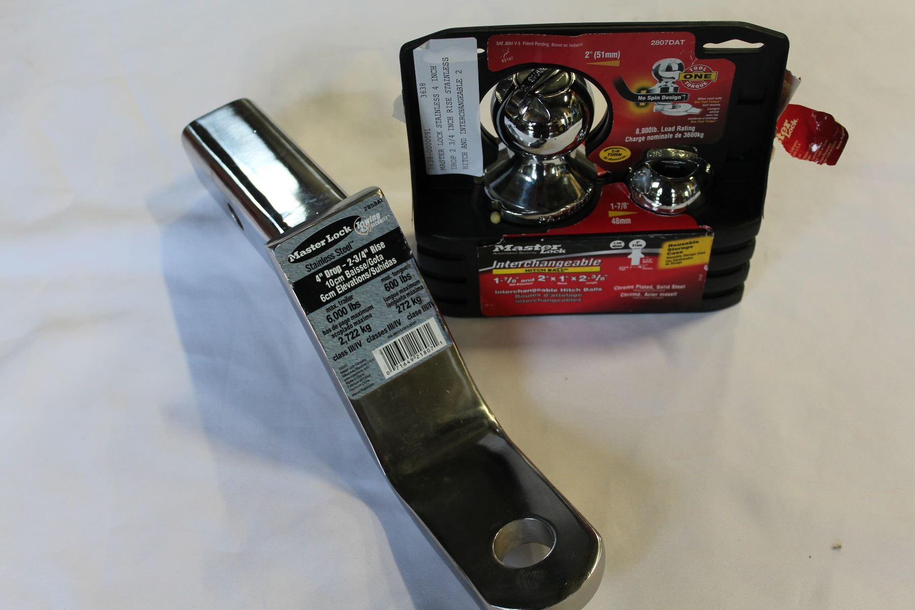 MASTER LOCK STAINLESS 4 INCH DROP 2 3/4 INCH RISE STAINLESS HITCH AND INTERCHANGEABLE 2 INCH AND 1 7/8 INCH HITCH BALLS