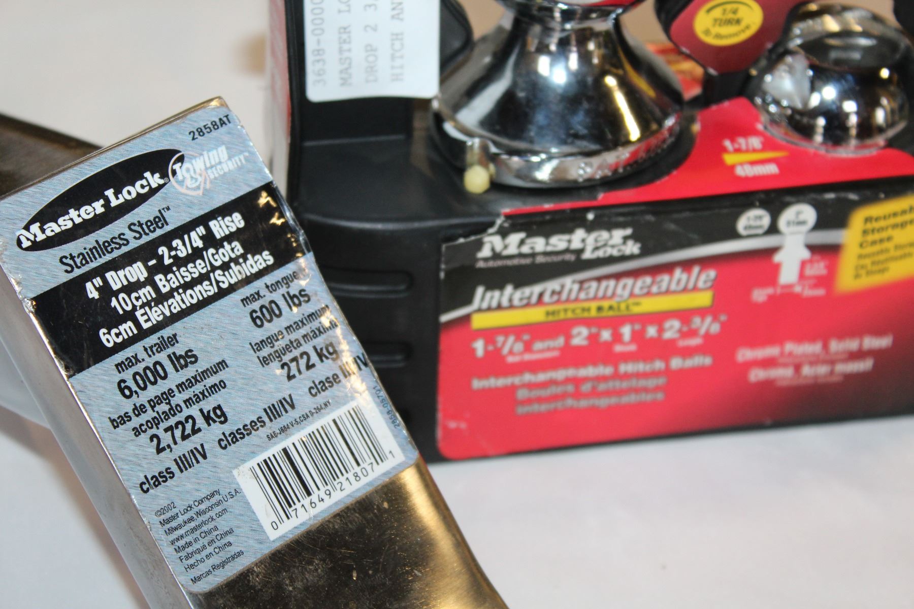 MASTER LOCK STAINLESS 4 INCH DROP 2 3/4 INCH RISE STAINLESS HITCH AND INTERCHANGEABLE 2 INCH AND 1 7