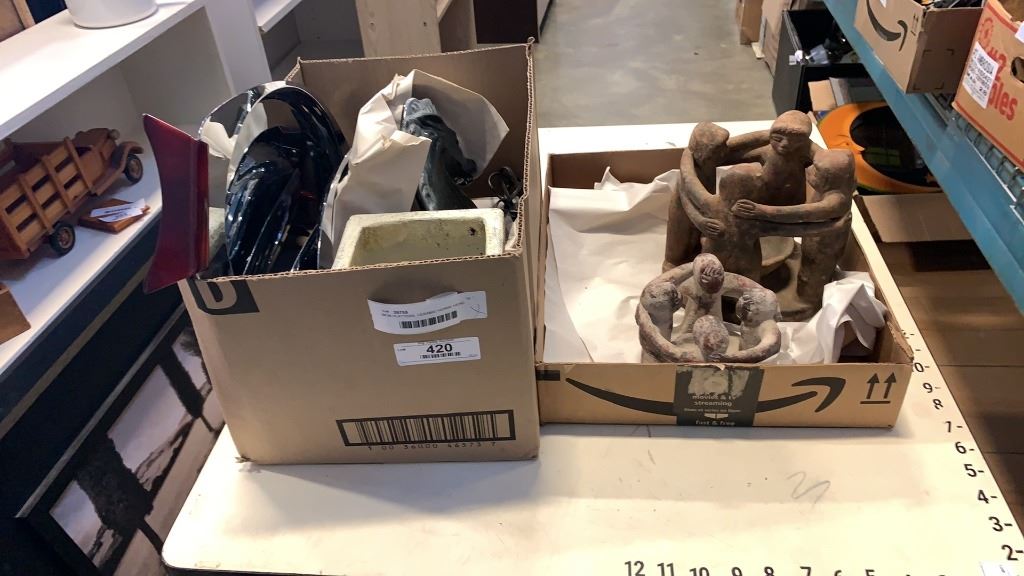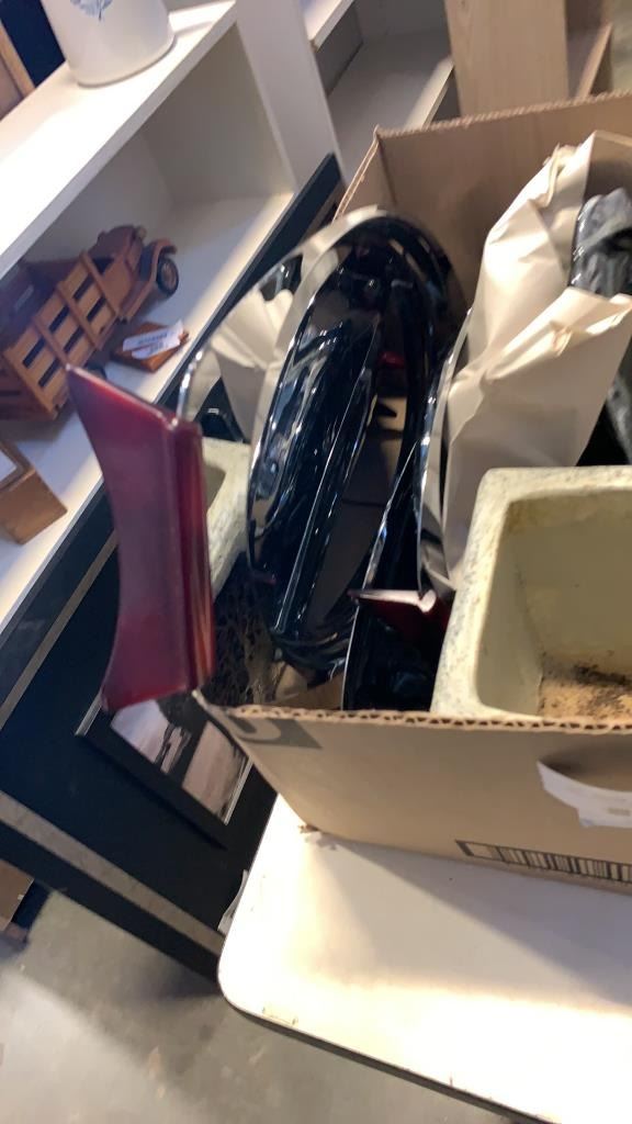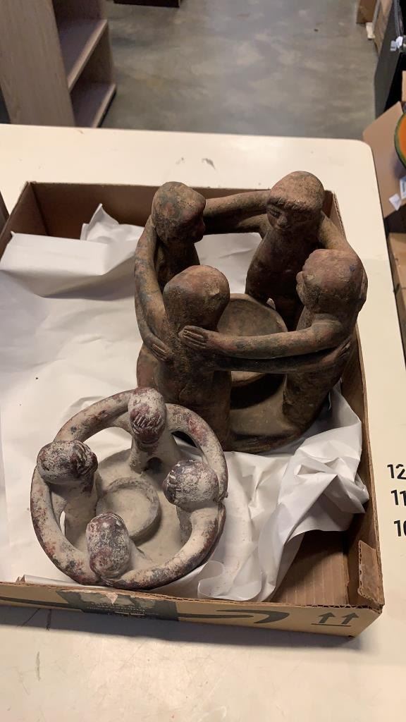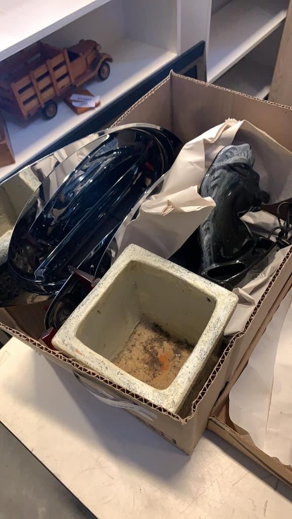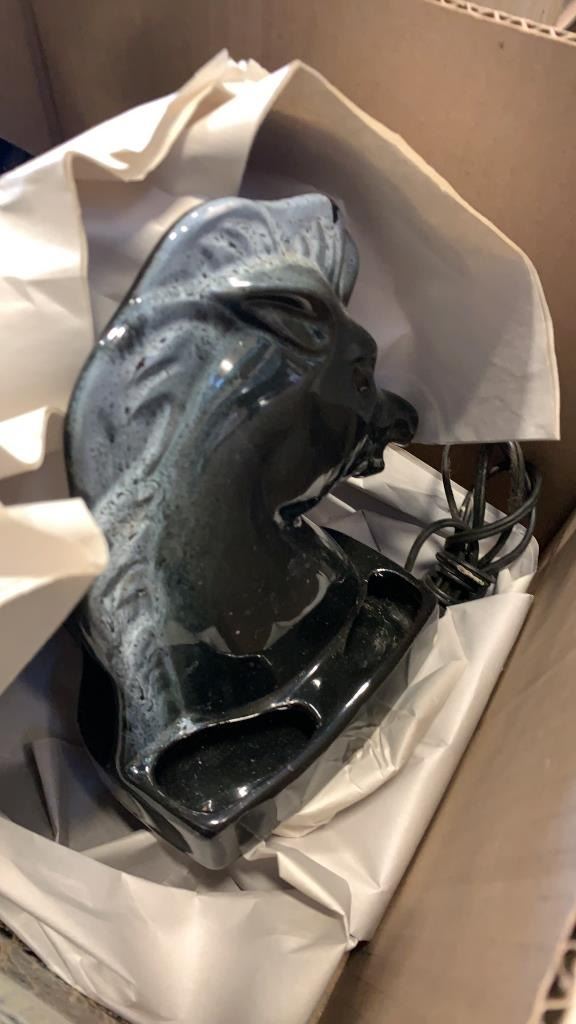 MCM PLATTERS, CERAMIC HORSE HEAD LAMP AND POTTERY CANDLE STANDS
