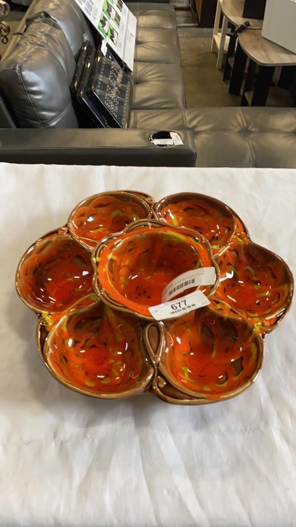 MCM POTTERY DIP SET AND COPPER BOAT FIGURE