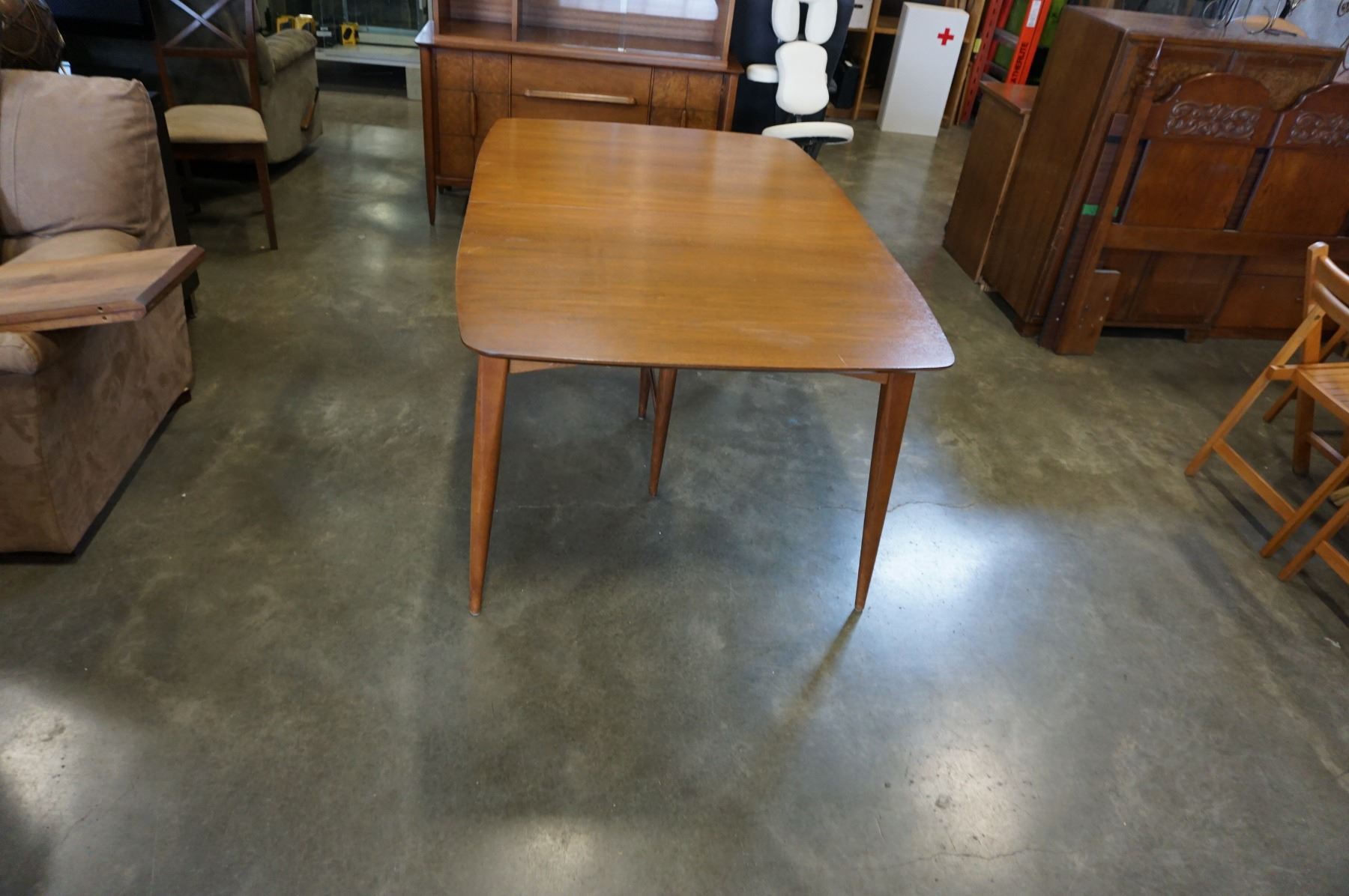 MCM STANLEY FURNITURE SOLID WALNUT DINING TABLE W/ JACKKNIFE LEAF, 2 EXTENTIONS, AND 6 LEATHER SEAT