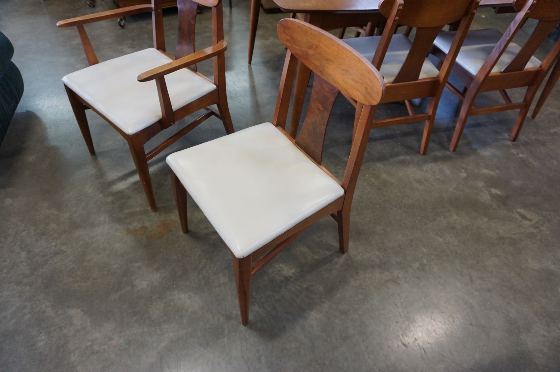 MCM STANLEY FURNITURE SOLID WALNUT DINING TABLE W/ JACKKNIFE LEAF, 2 EXTENTIONS, AND 6 LEATHER SEAT CHAIRS