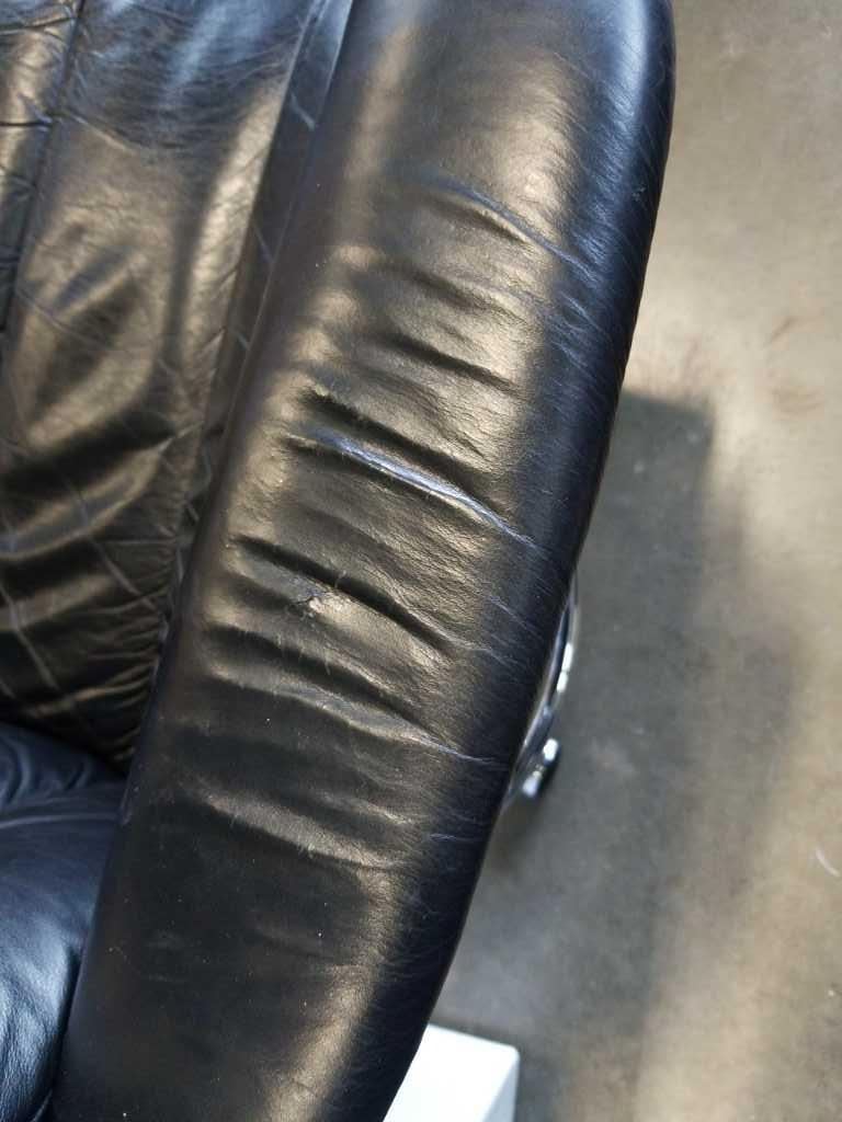 MCM STRESSLESS EKORNES LEATHER ROLLING OFFICE CHAIR - MADE IN NORWAY VINTAGE MID CENTURY - VISIBLE WEAR ON ARMREST, RIGHT ARM CLAMP DAMAGED