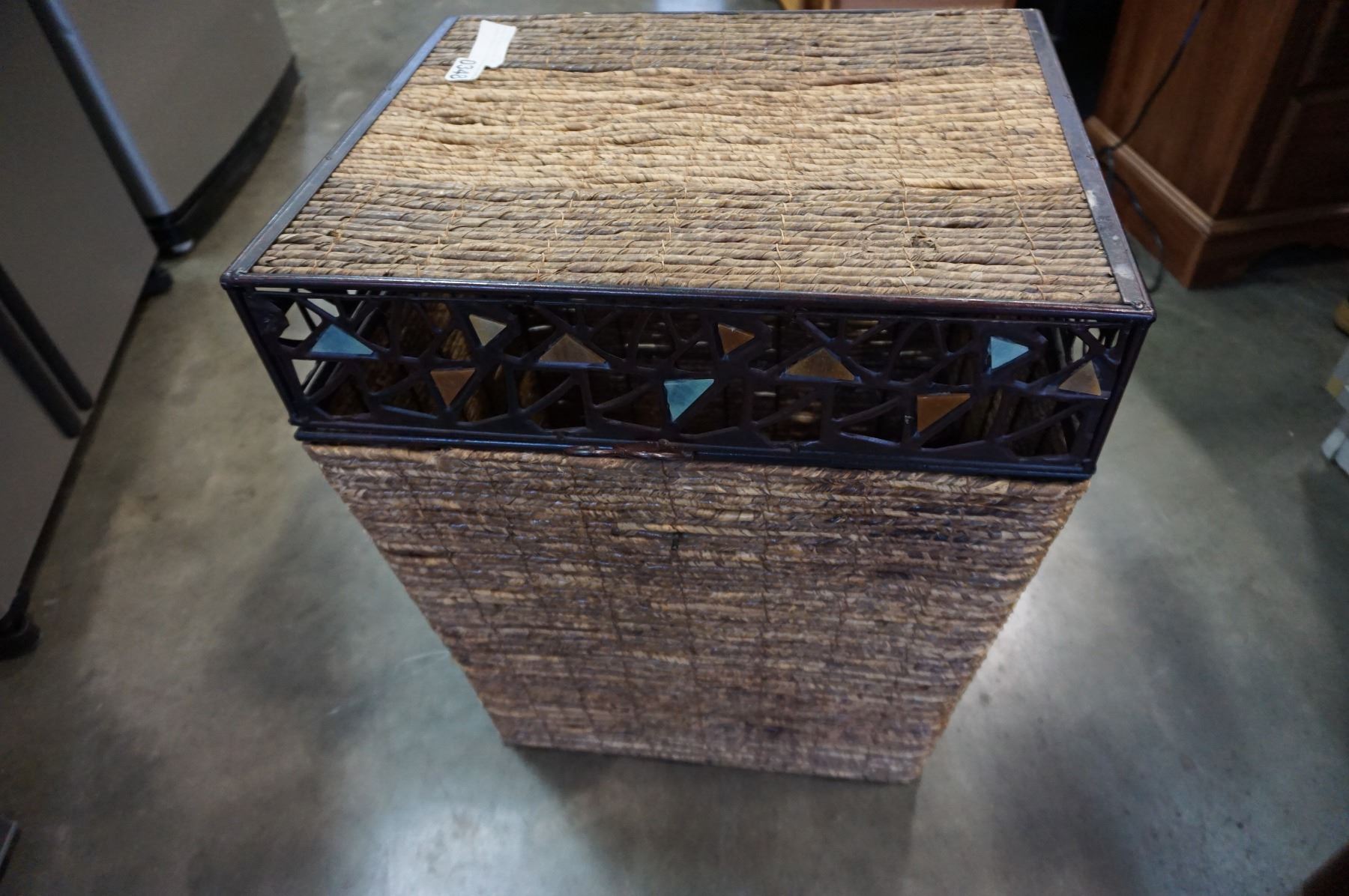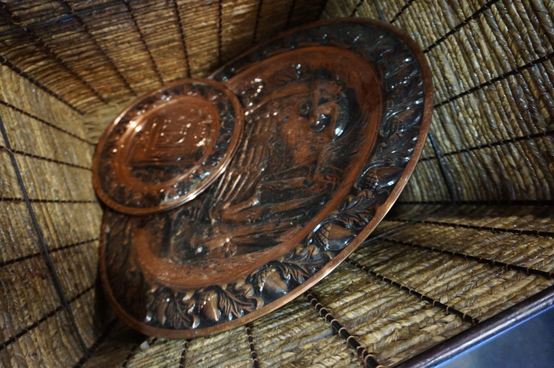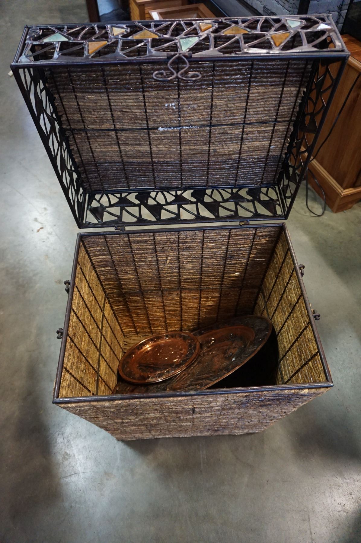METAL AND RATTAN TRUNK AND 3 COPPER DECORATIVE PLATES