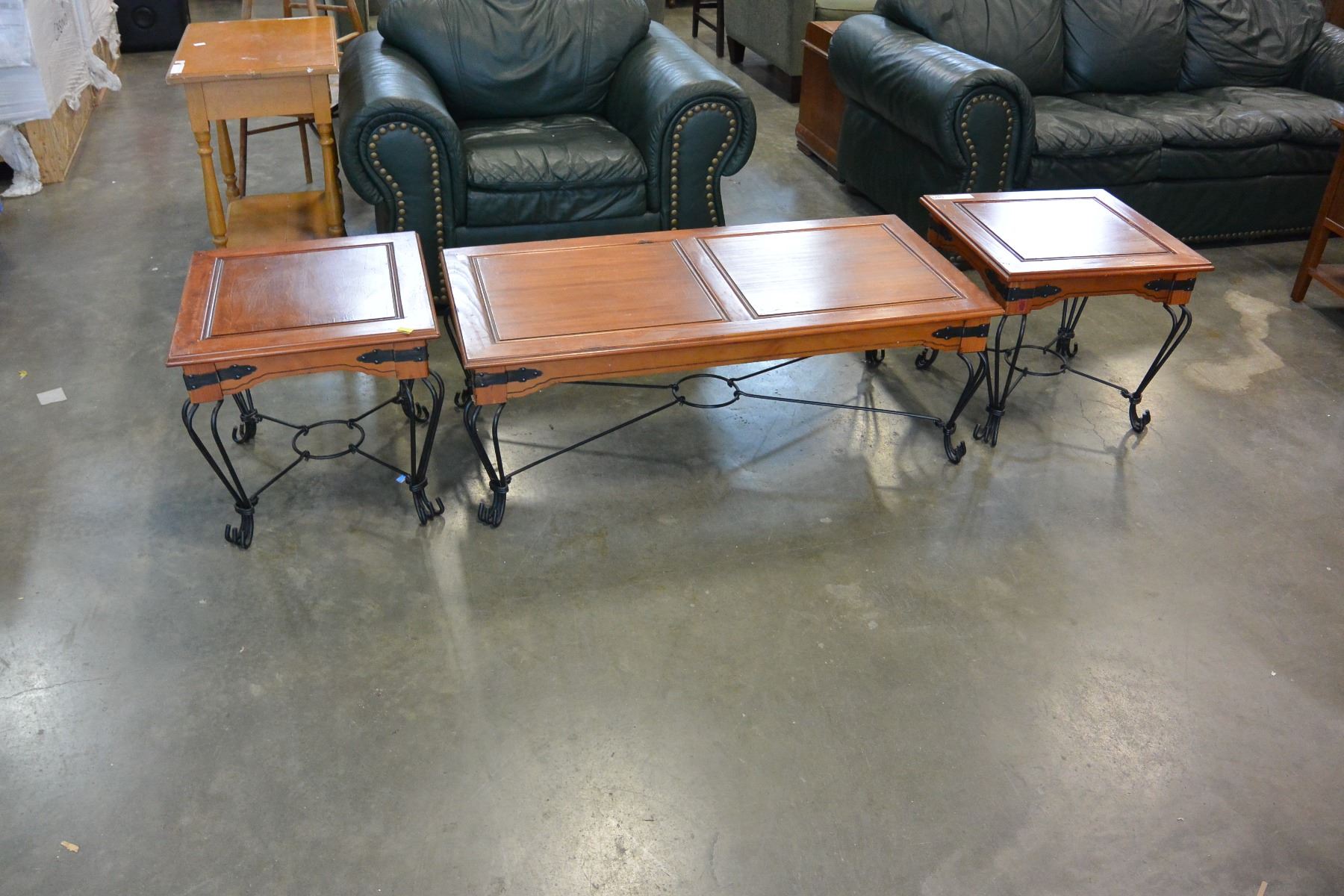 METAL AND WOOD COFFEE AND TWO ENDTABLES SET