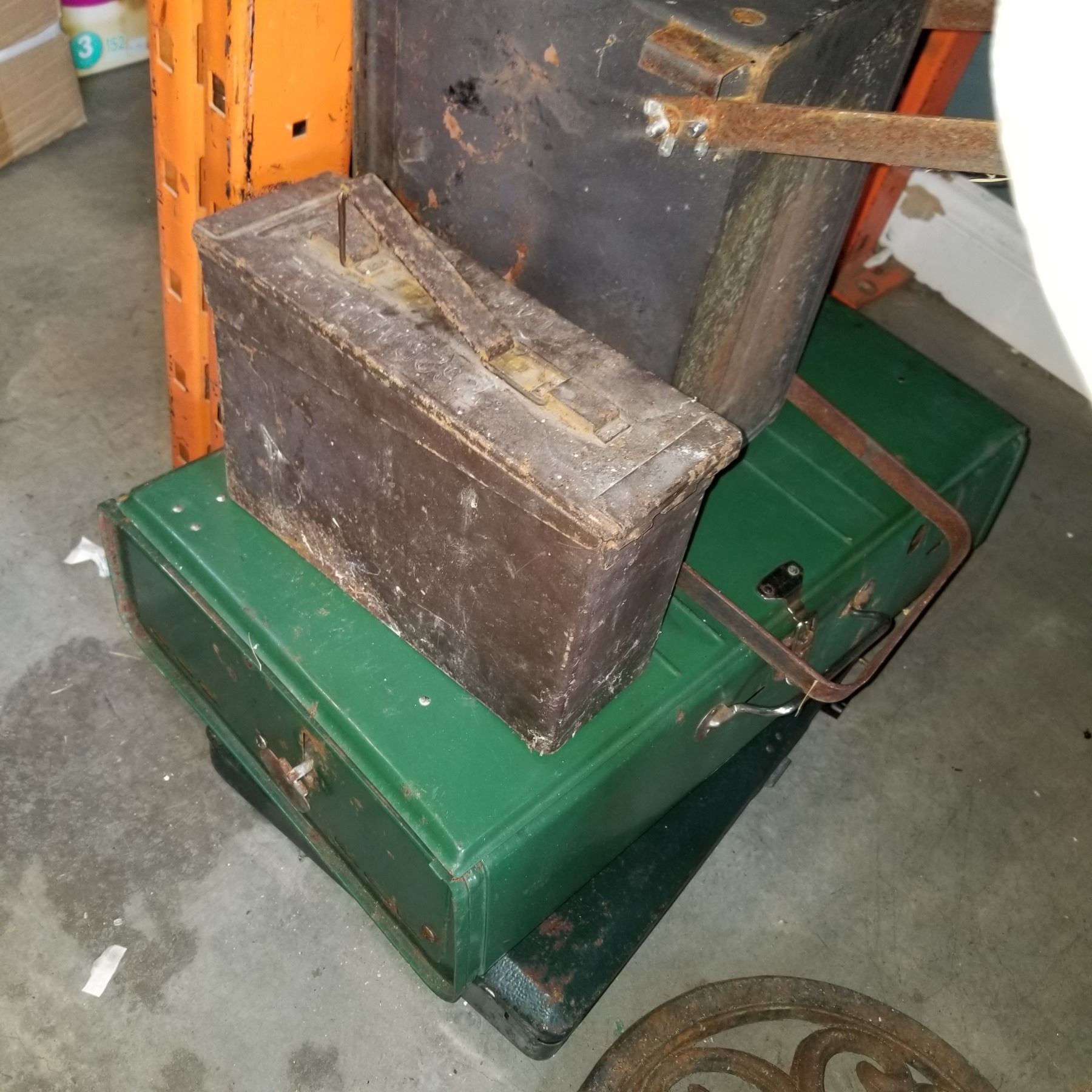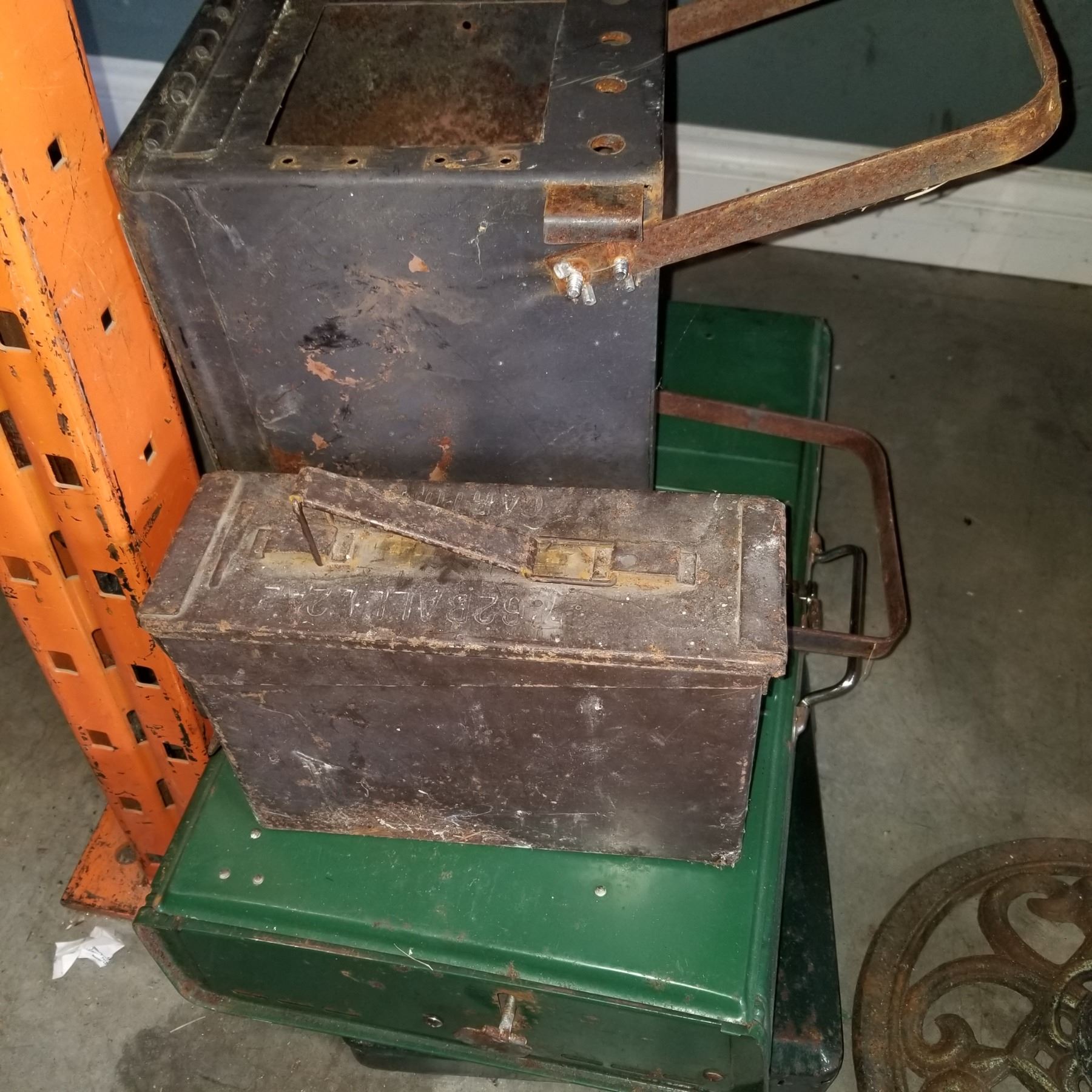 METAL BIRD BATH, 2 CAMP STOVES, AMMO BOX, AND MORE
