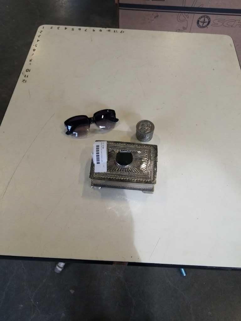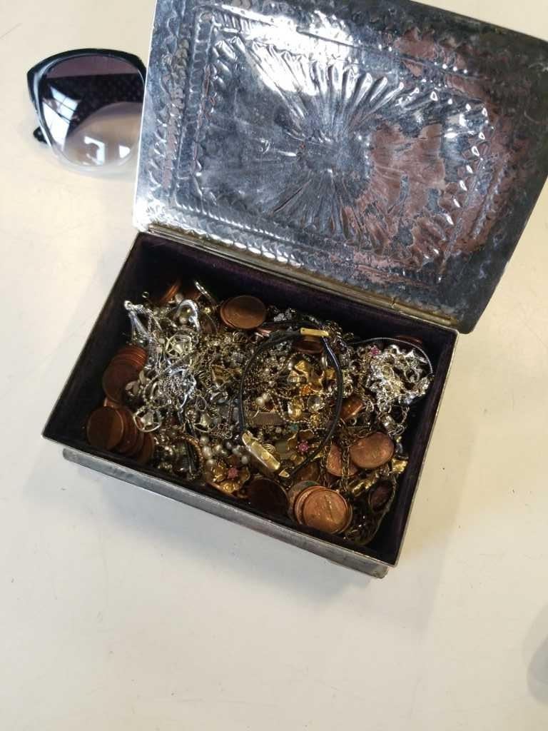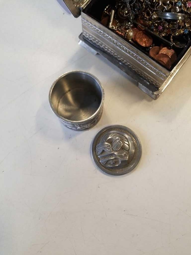 METAL FIRST NATIONS LIDDED JAR, JEWLERY BOX WITH CONTENTS, SUNGLASSES, WATCH