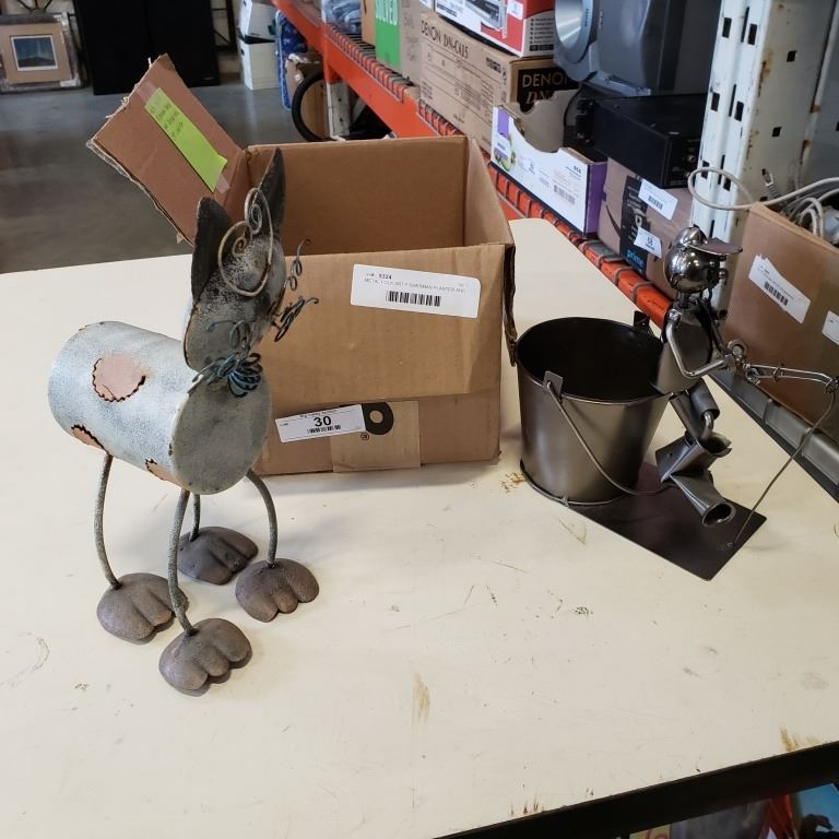 METAL FOLK ART FISHERMAN PLANTER AND METAL CAT LAWN ART