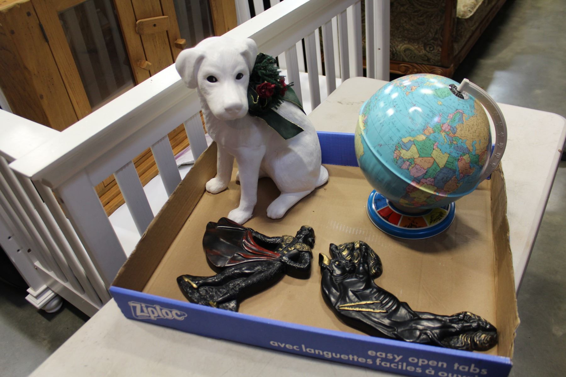 METAL GLOBE BULLFIGHTER WALL HANGING AND DOG STATUE