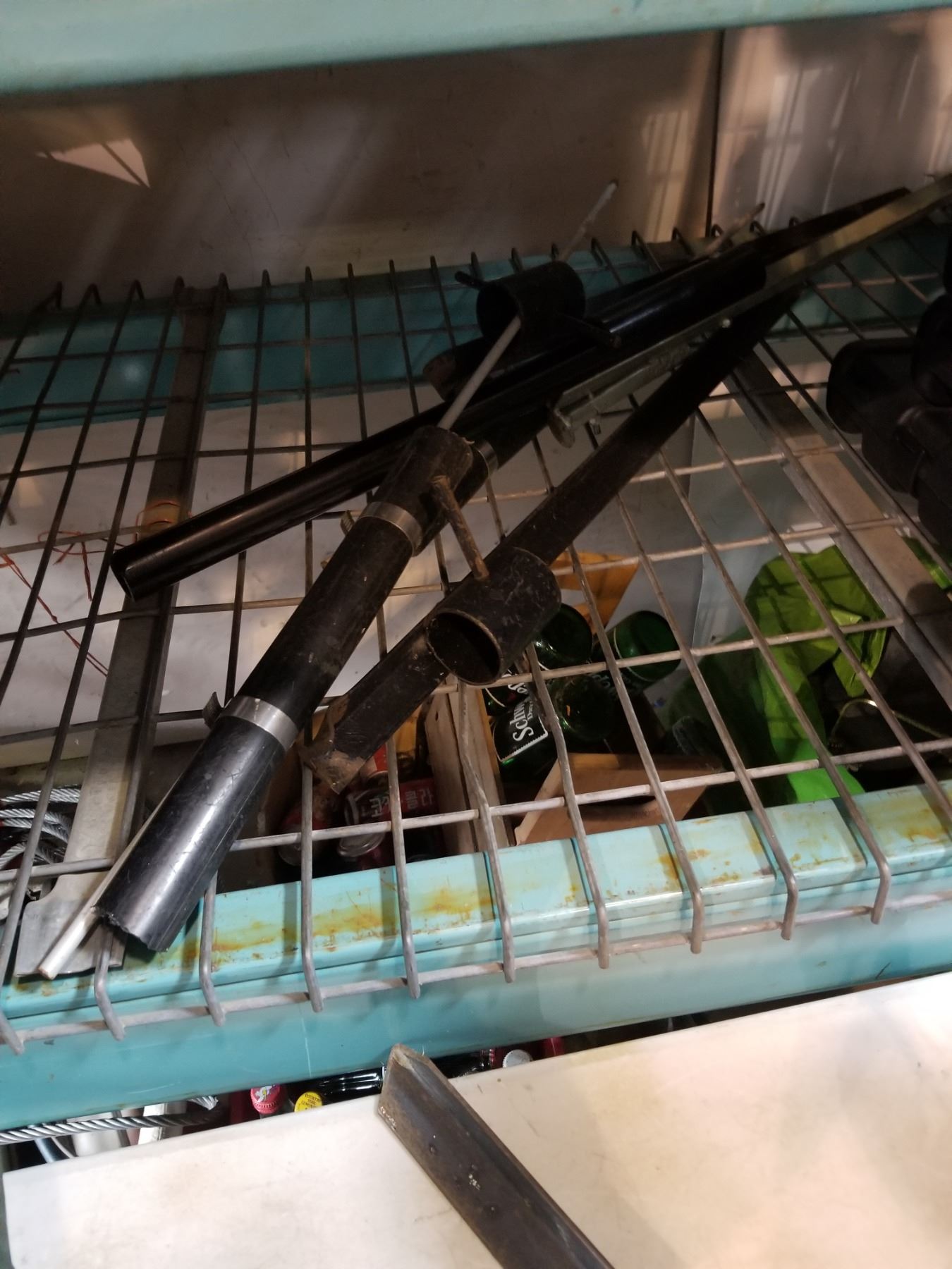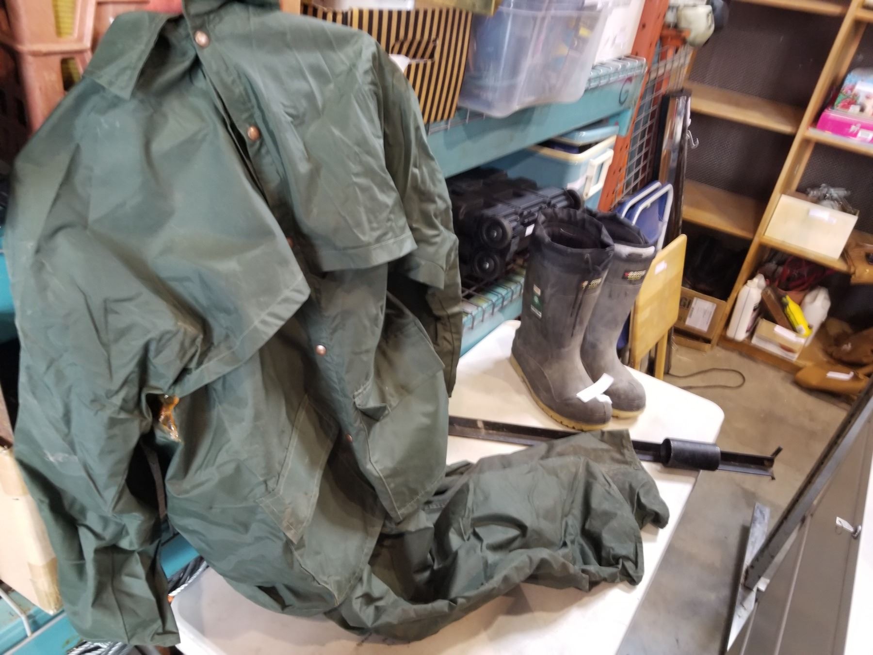 METAL ROD HOLDERS, BAFFIN OARPRENE SIZE 10 FISHING BOOTS, AND ADMIRAL X LARGE WADERS AND COAT