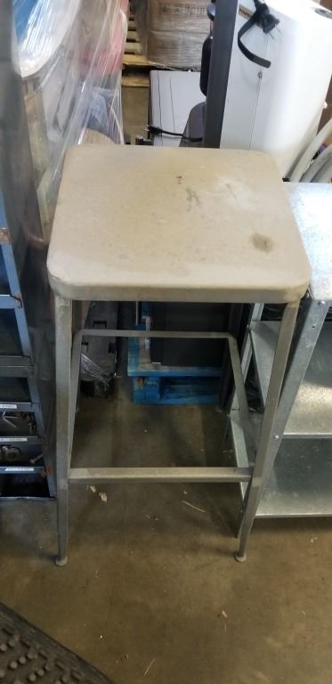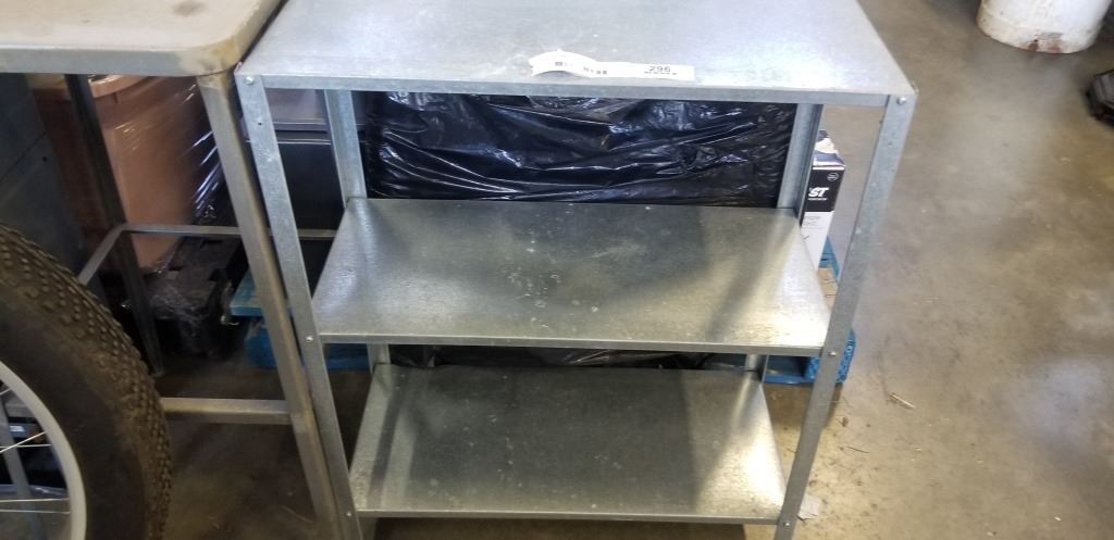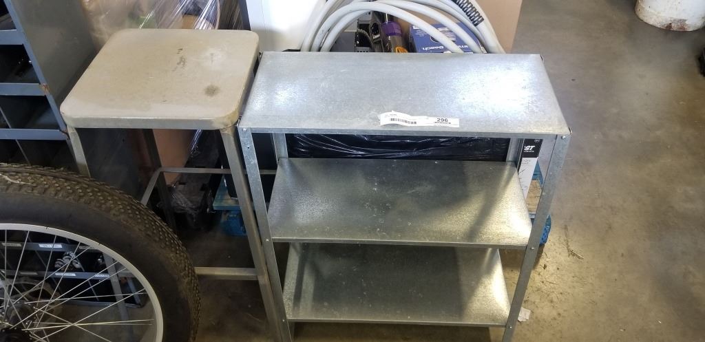 METAL SHOP SHELF, STOOL AND 50FT GARDEN HOSE