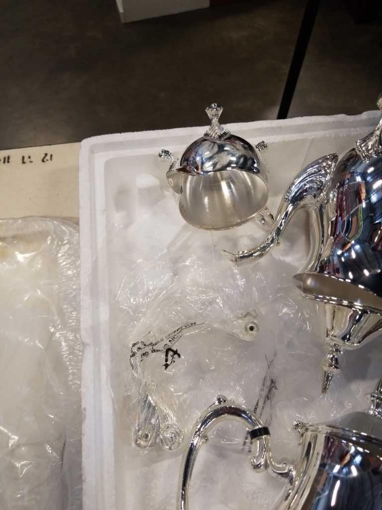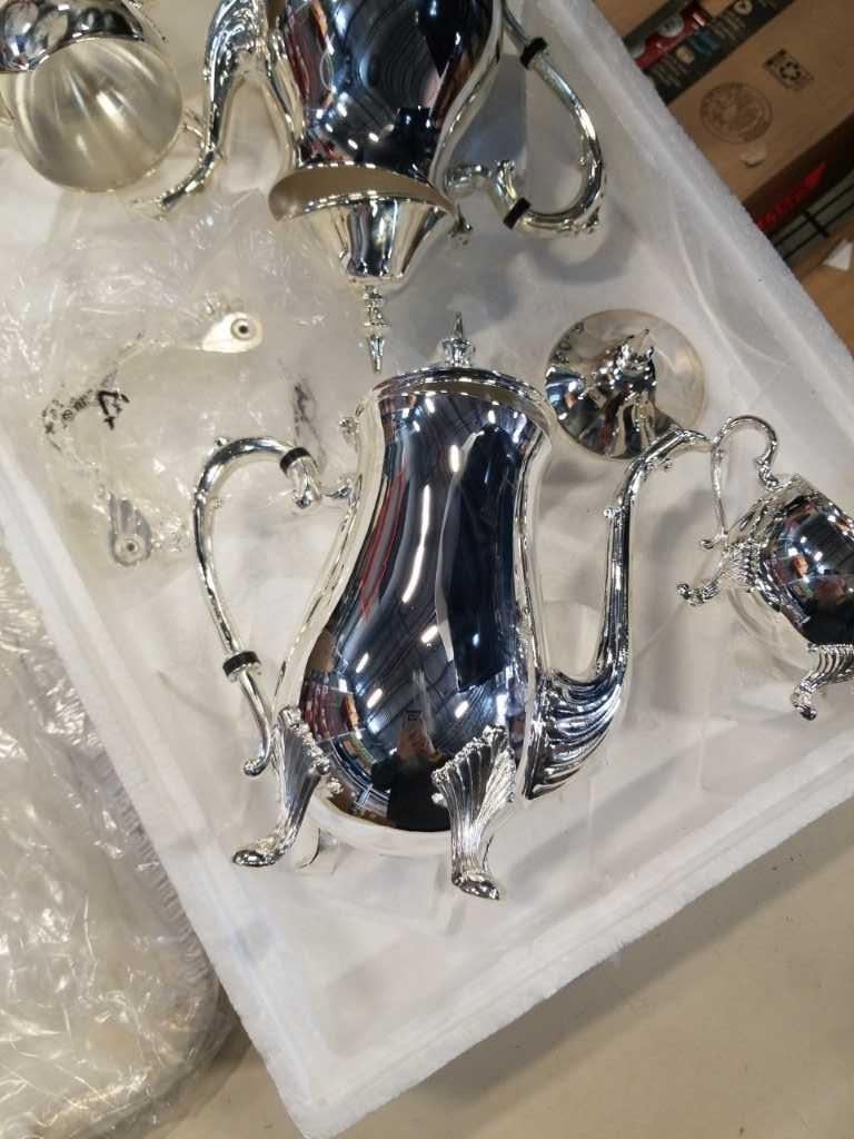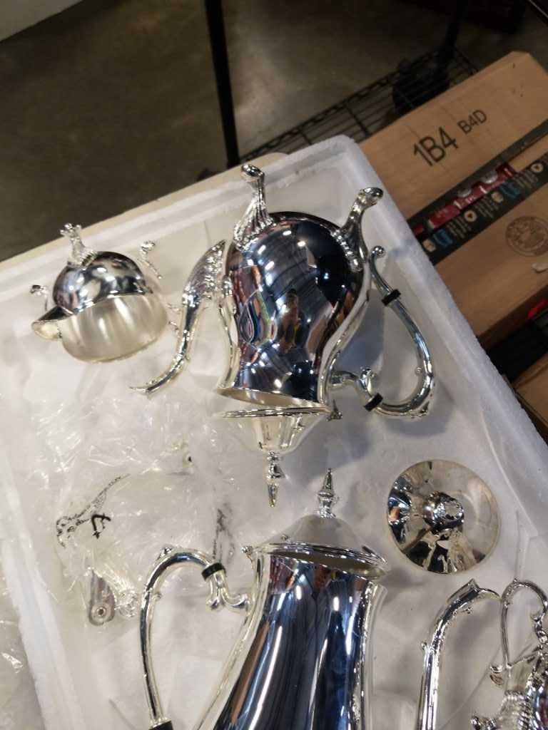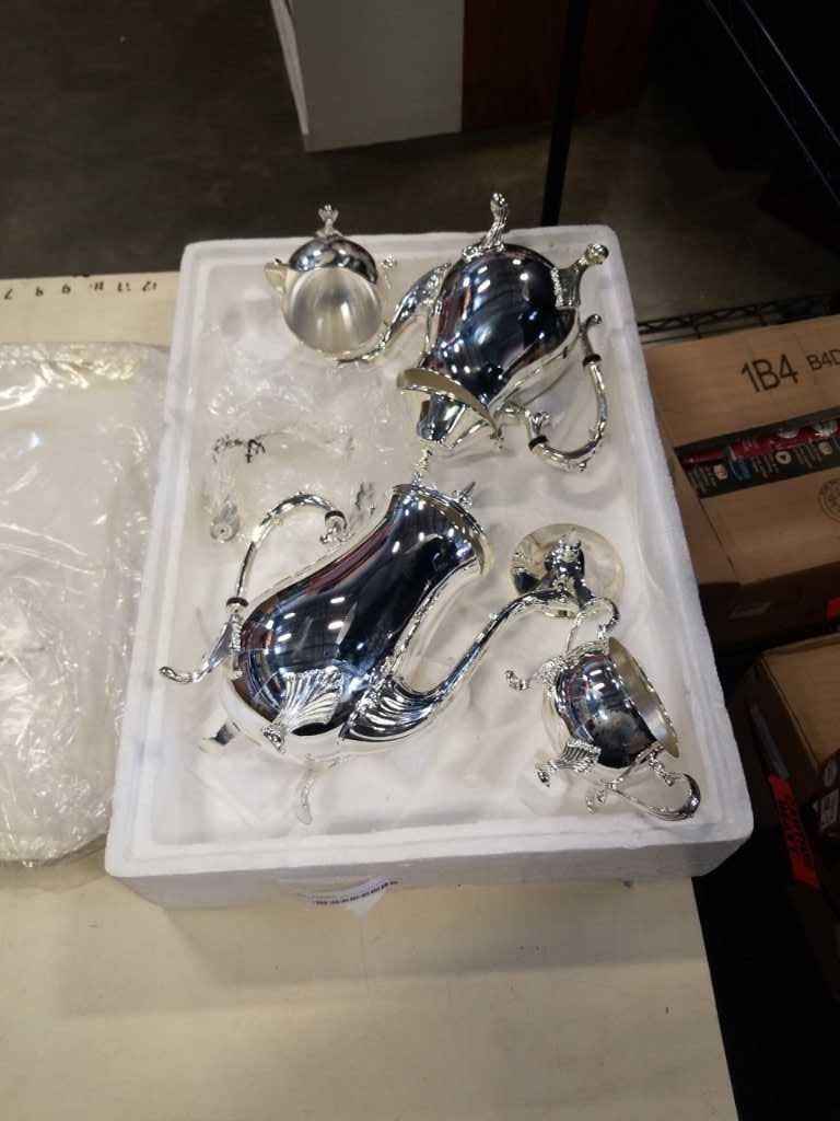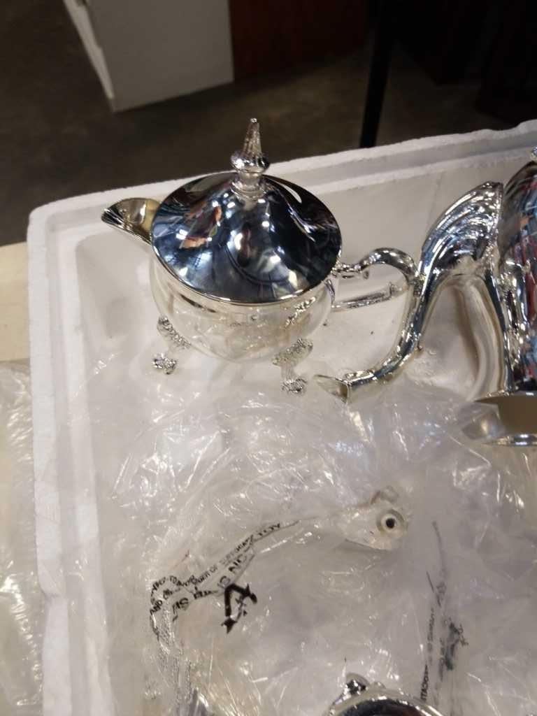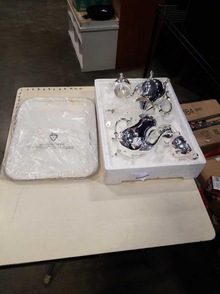 METAL TEAPOT AND COFFEE POT WITH CREAM AND SUGAR AND NEW TRAY