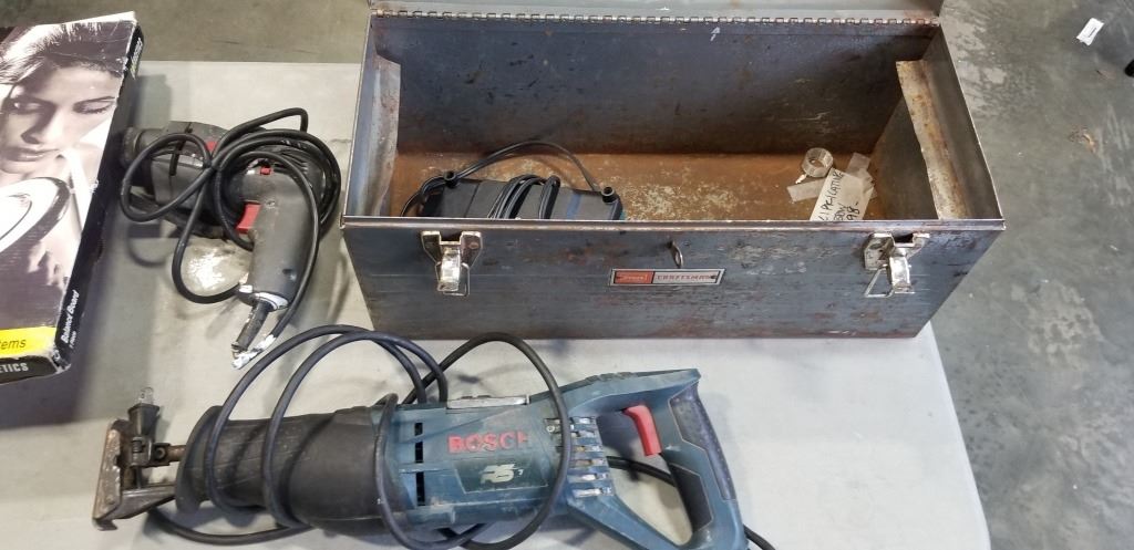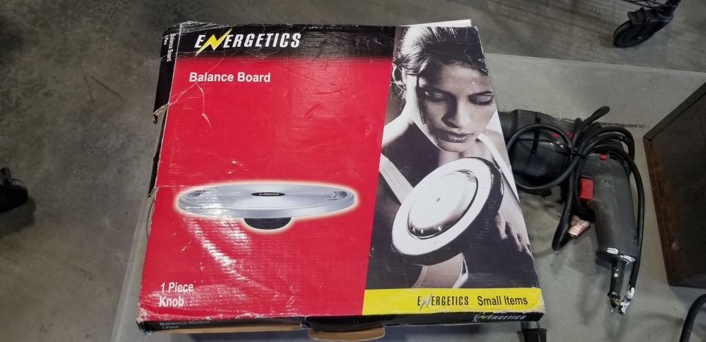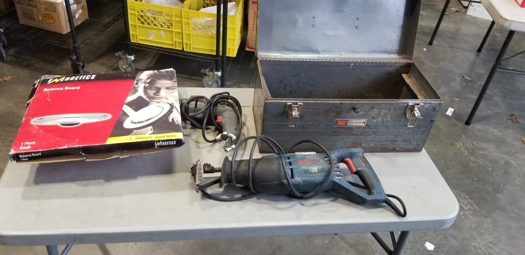 METAL TOOL BOX W/ 2 POWER TOOLS, AND BALANCE BOARD