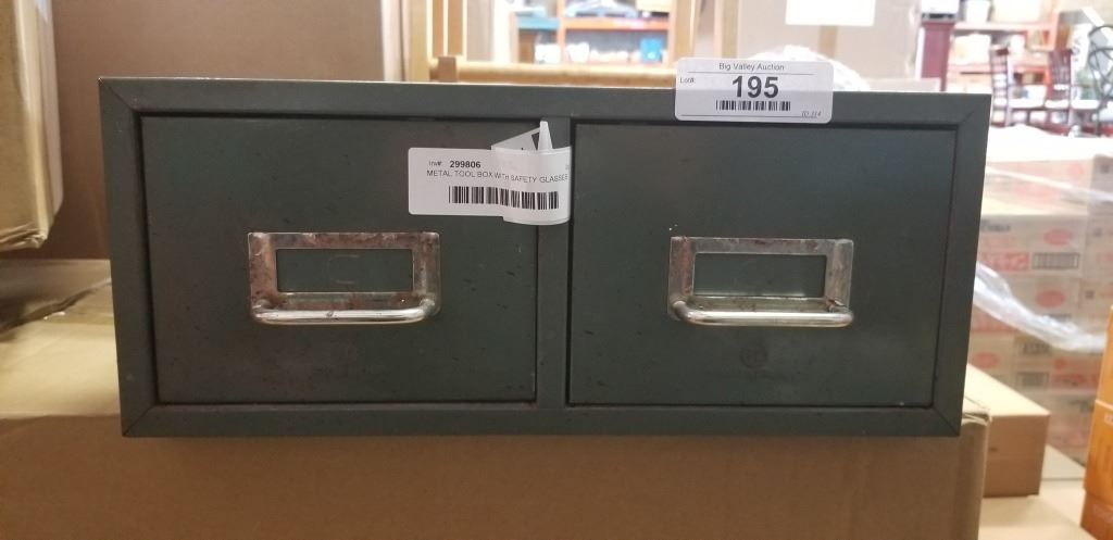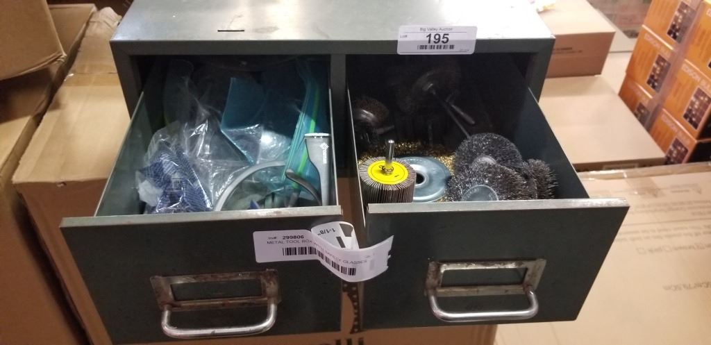 METAL TOOL BOX WITH SAFETY GLASSES AND GRINDING WHEELS
