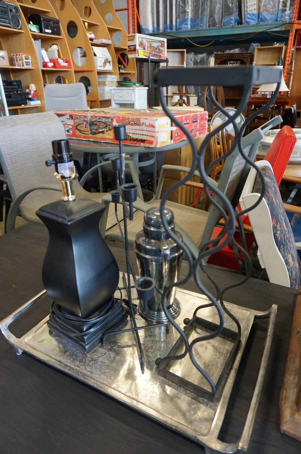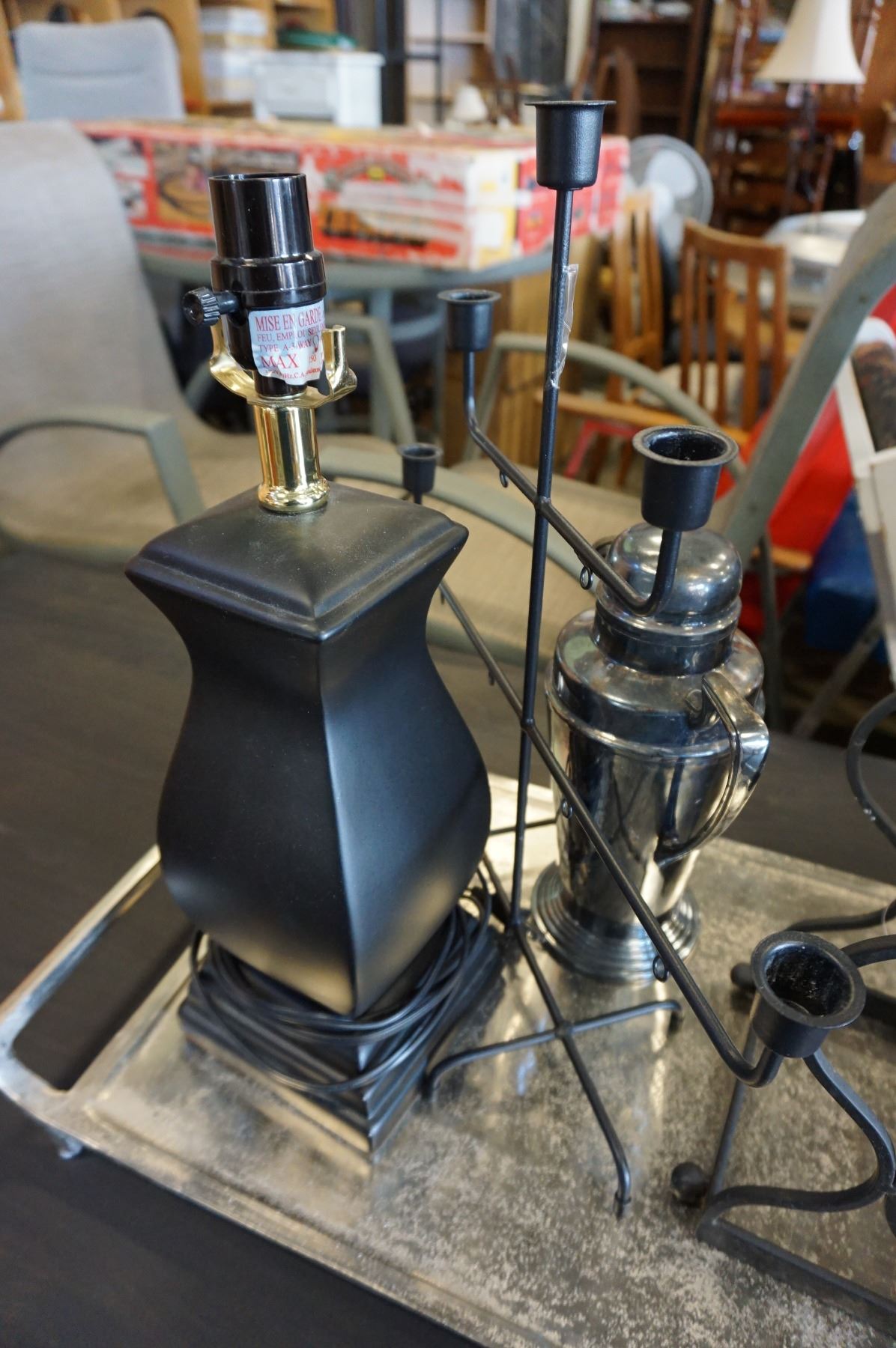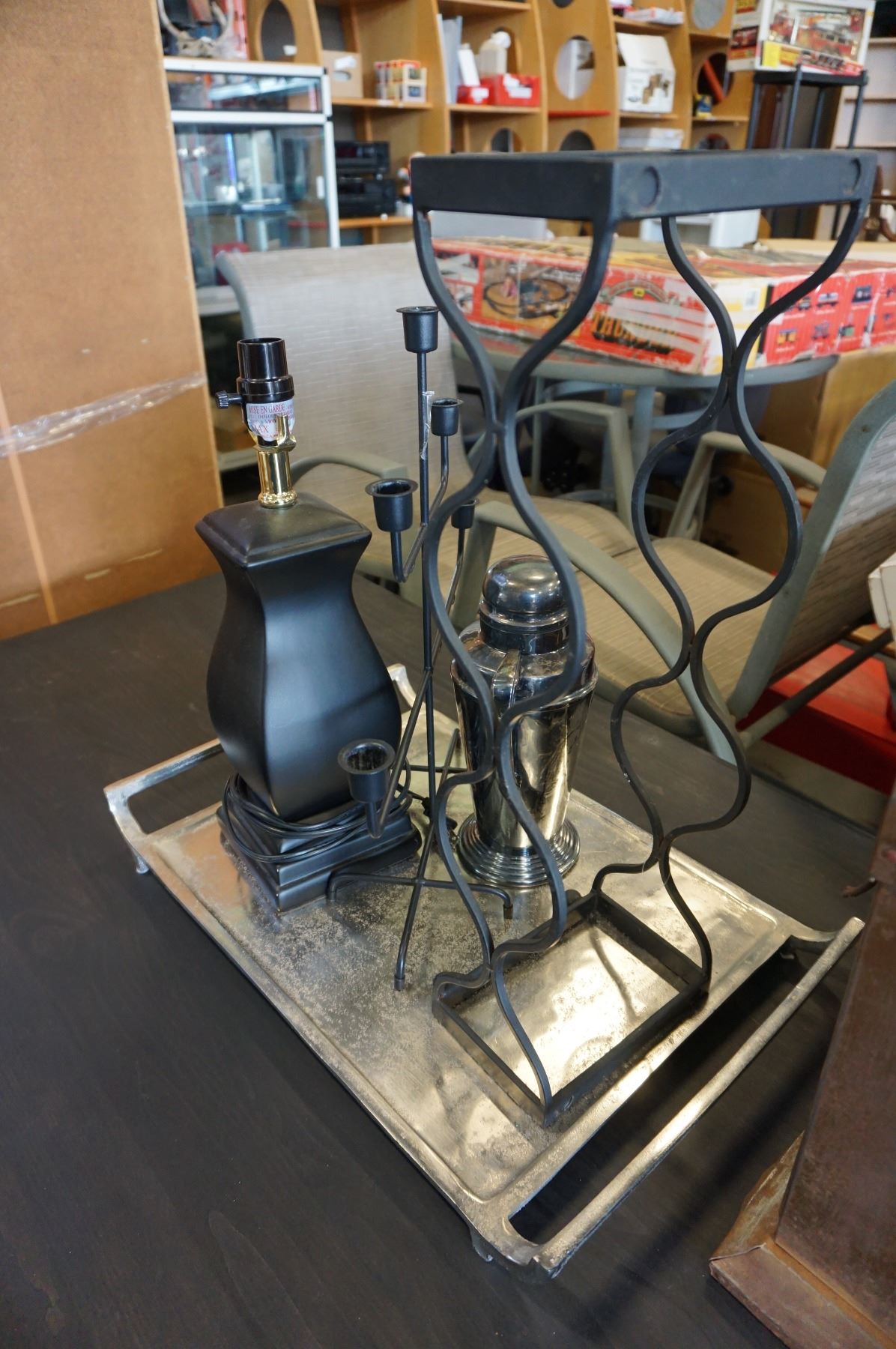 METAL TRAY, COFFEE POT, WINE RACK, CANDELABRA AND LAMP