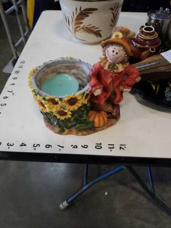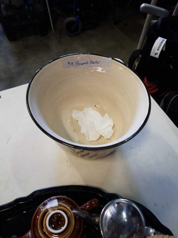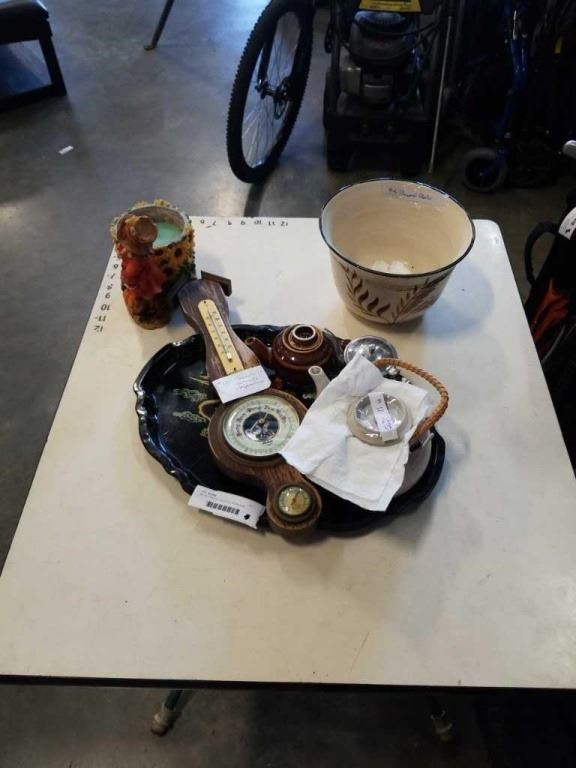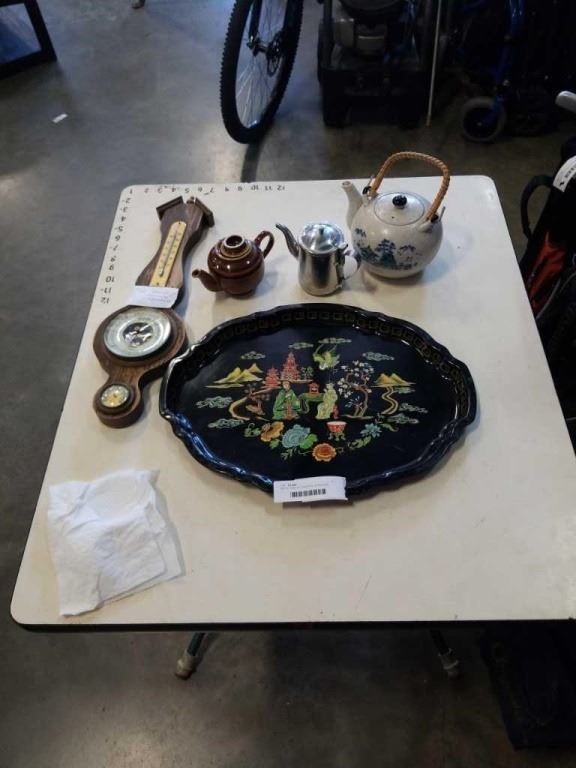 METAL TRAY OF TEAPOTS, STAINLESS CREAMER, THERMOMETER BAROMETER AND 2 PLANTERS