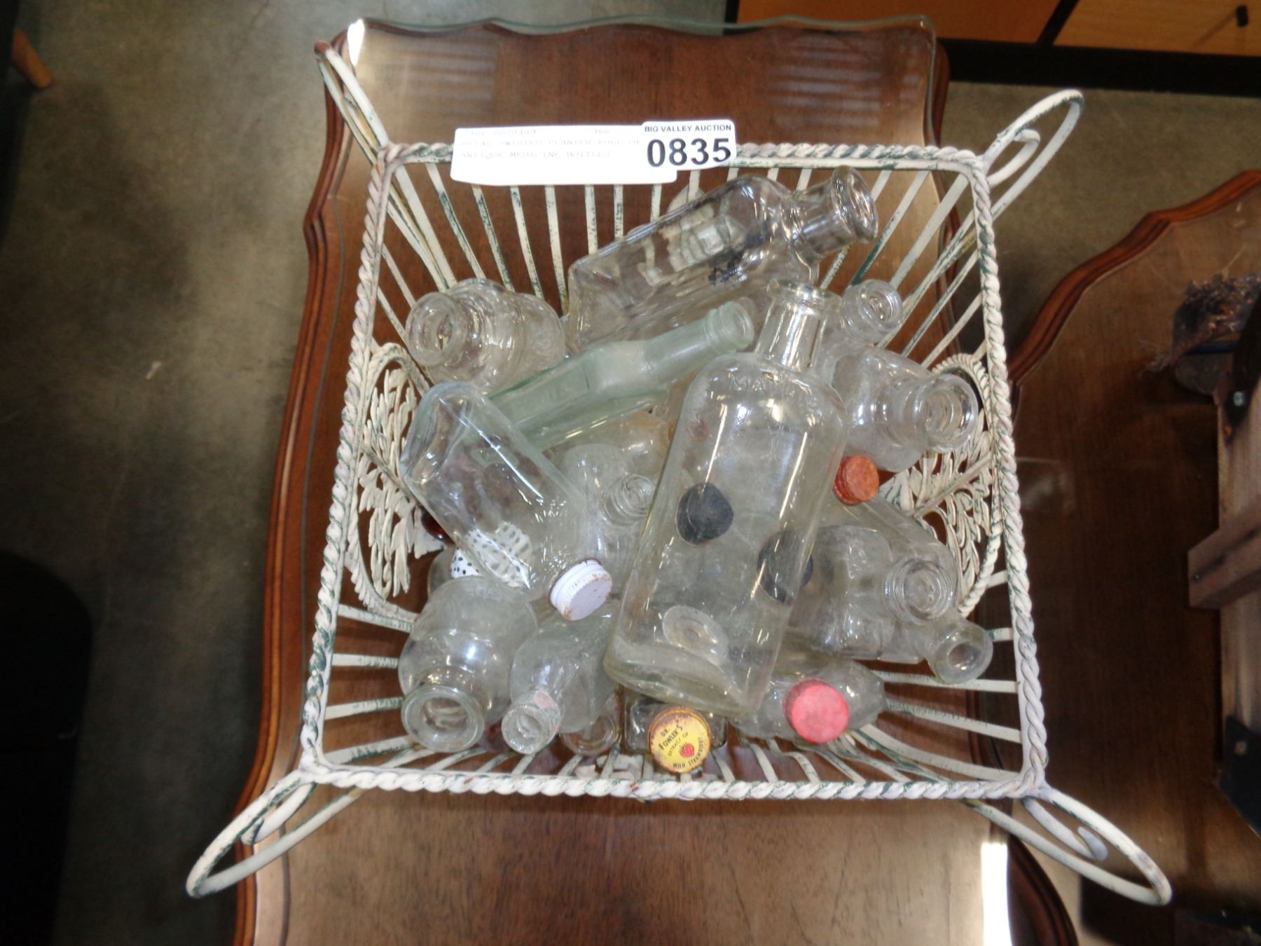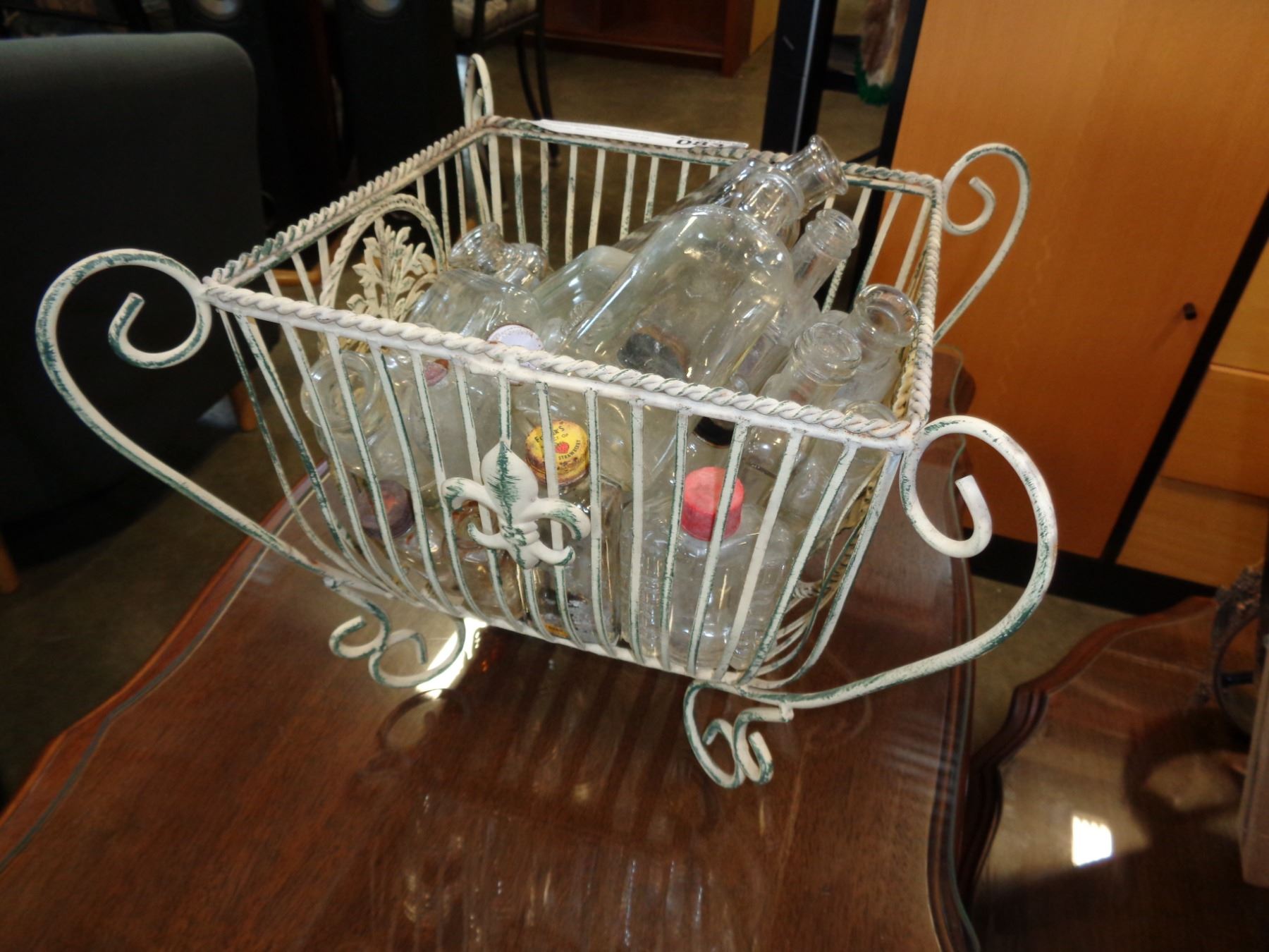METAL TWISTED PLANTER FULL OF ANTIQUE MEDICINE BOTTLES