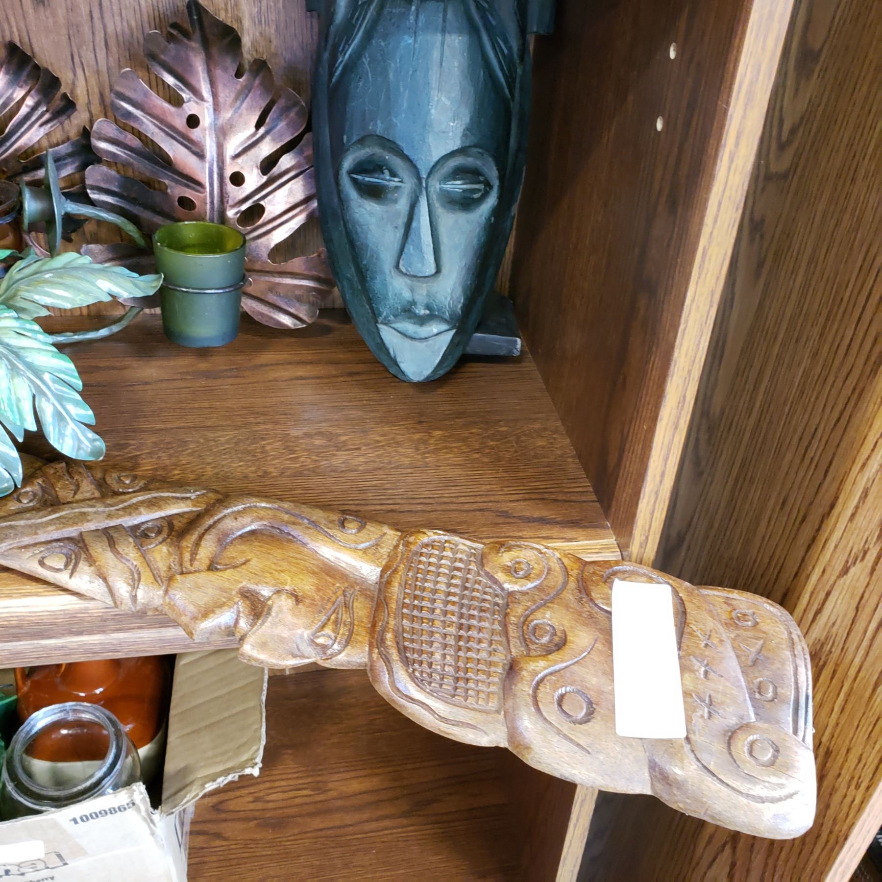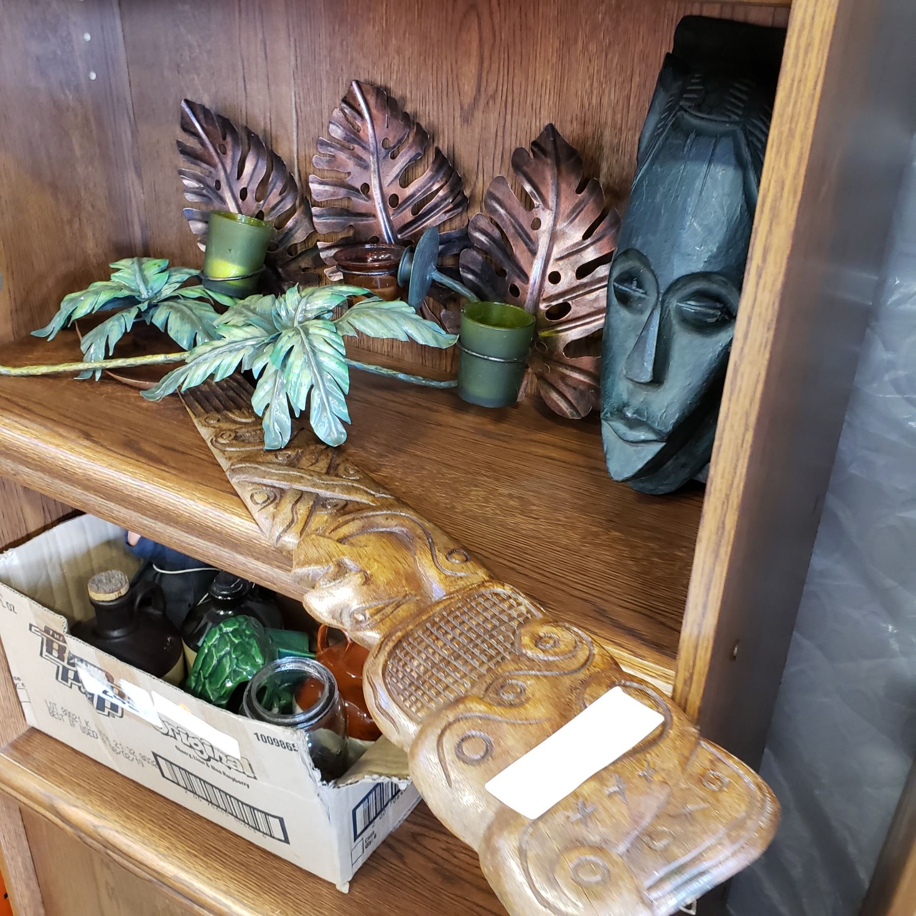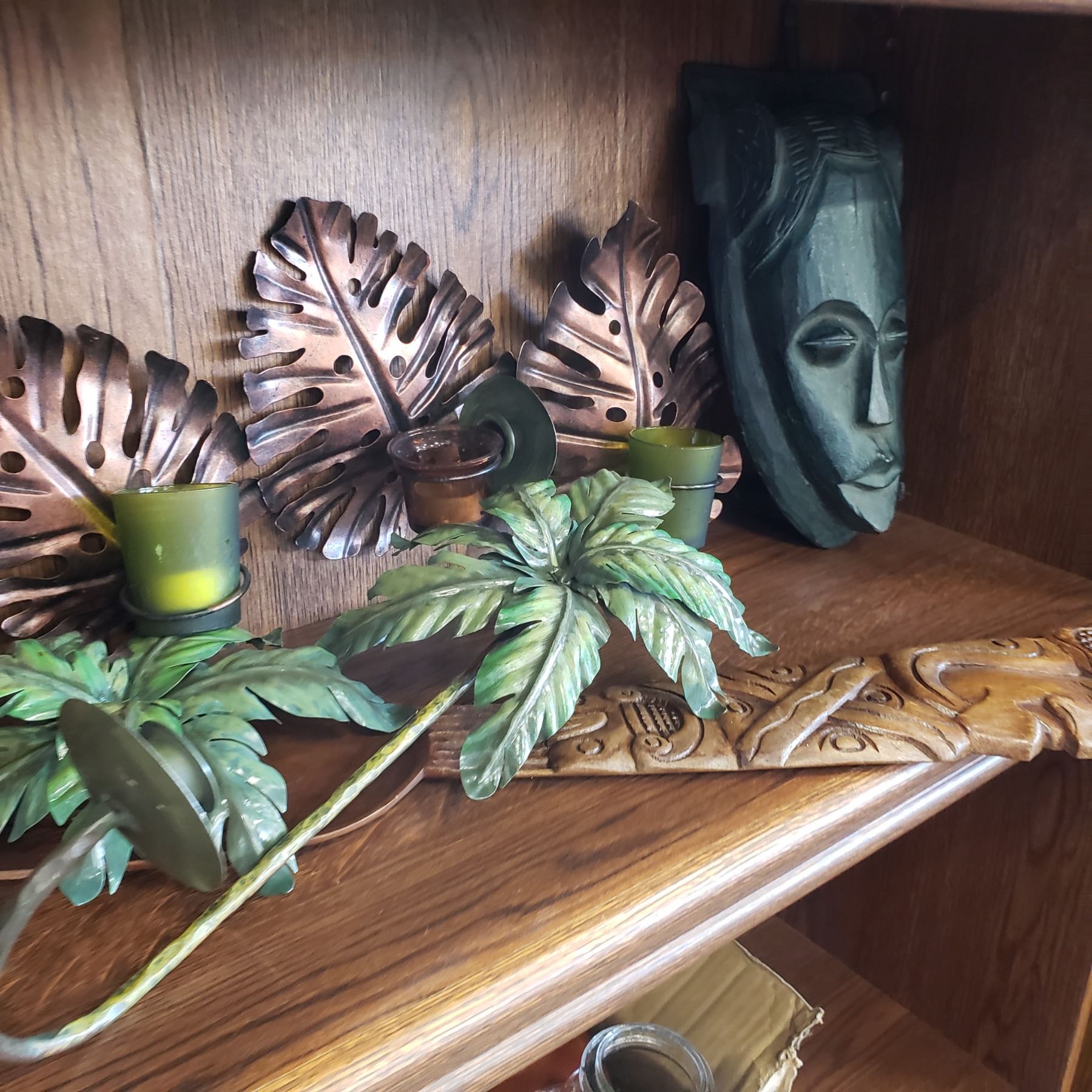 METAL WALL CANDLE HOLDERS, WOOD MASK ON STNAD, AND CARVED FORK DECORATION
