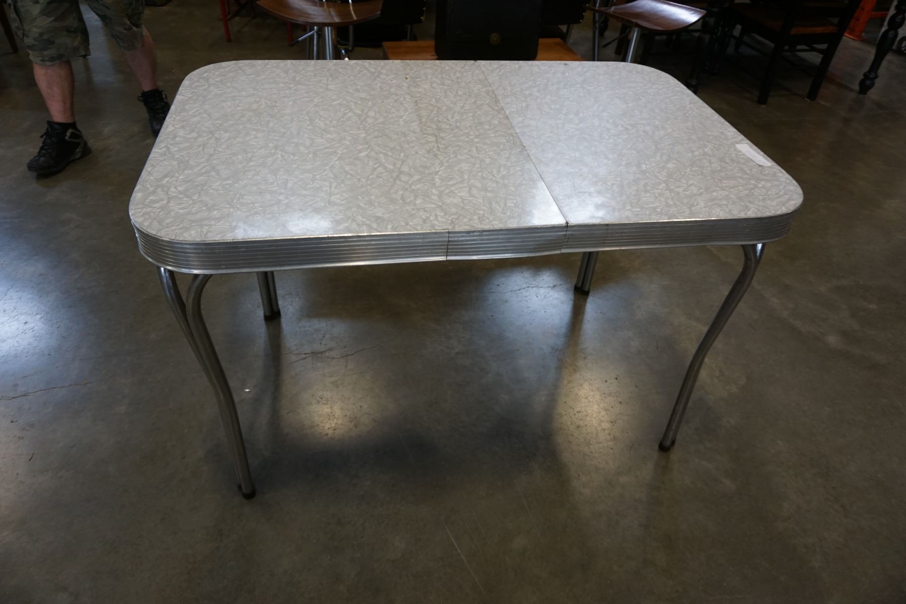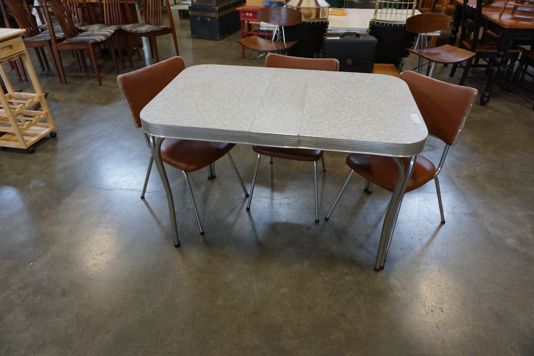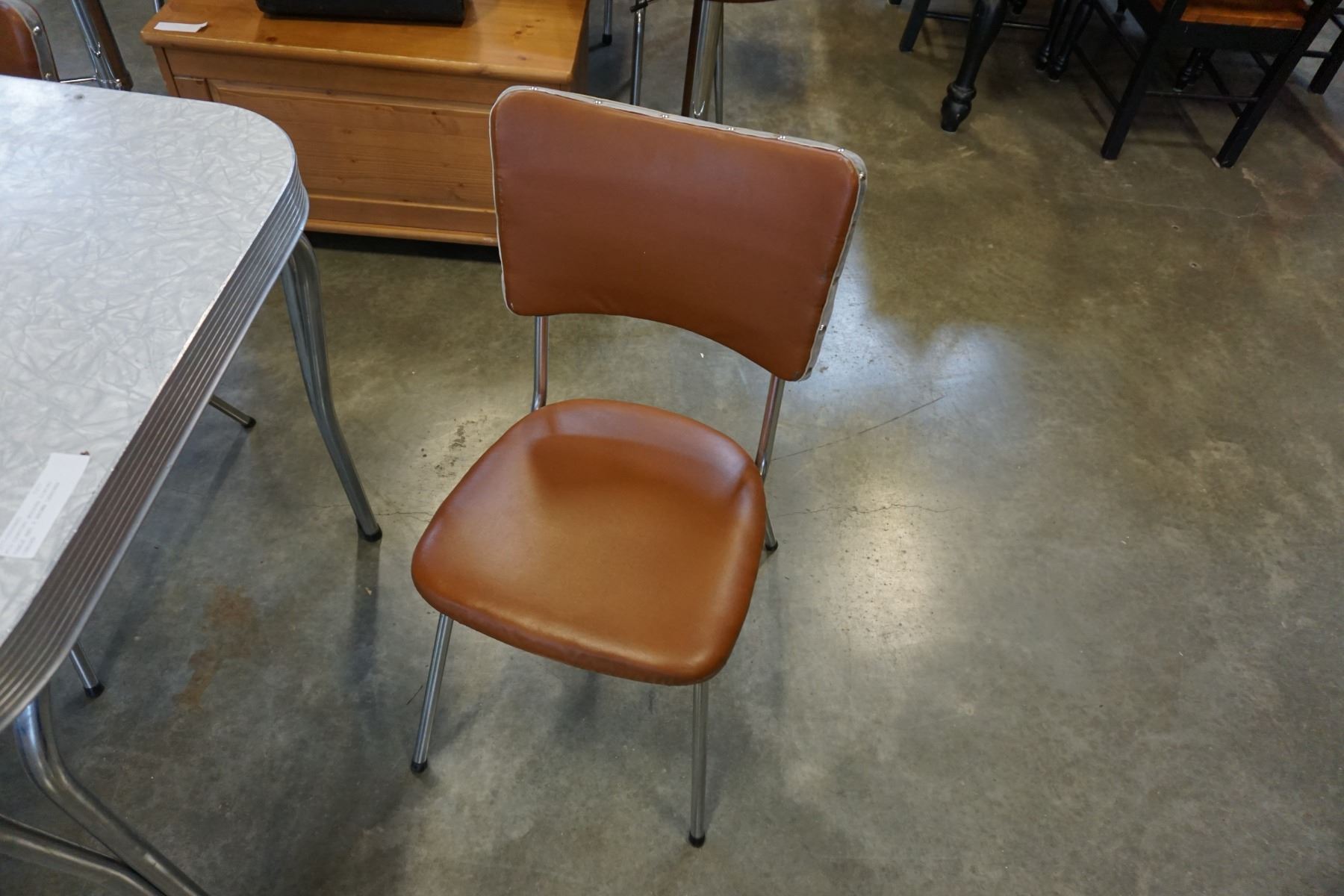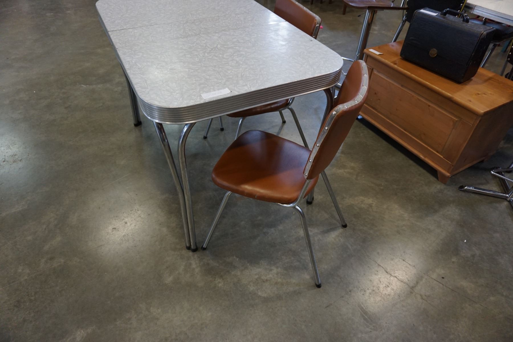 MID CENTURY MODERN DINING TABLE AND 3 BROWN LEATHER CHAIRS