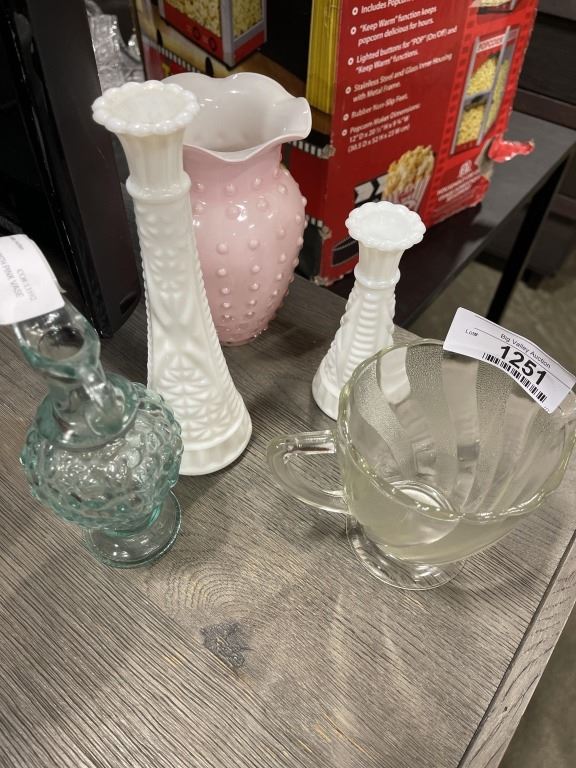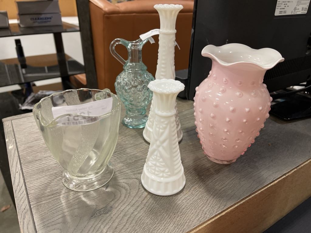 MILK GLASS CANDLE HOLDERS WITH PINK VASE AND CLEAR GLASS COLLECTIBLES