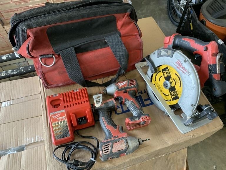 MILWAUKEE 3PC CORDLESS TOOL SET, 2 IMPACT DRILLS, AND CIRCULAR SAW, WITH CHARGER, AND BAG NO BATTERIES, TESTED WORKING