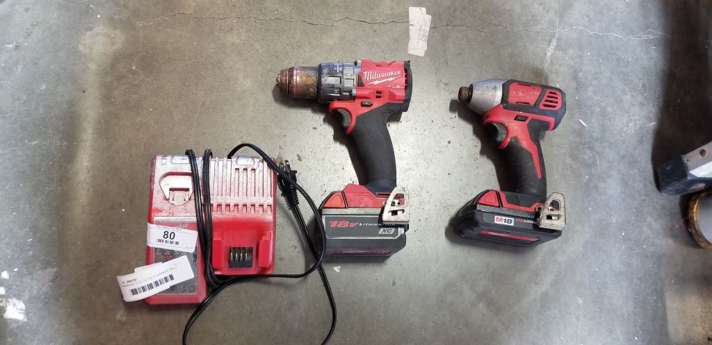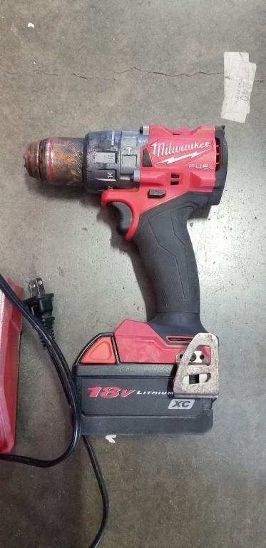 MILWAUKEE FUEL 1/2 INCH HAMMER DRILL DRIVER, IMPACT GUN, AND RAPID CHARGER WORKING, 2 BATTERIE SINLCUDED BUT BOTH APPEAR TO BE DUDS