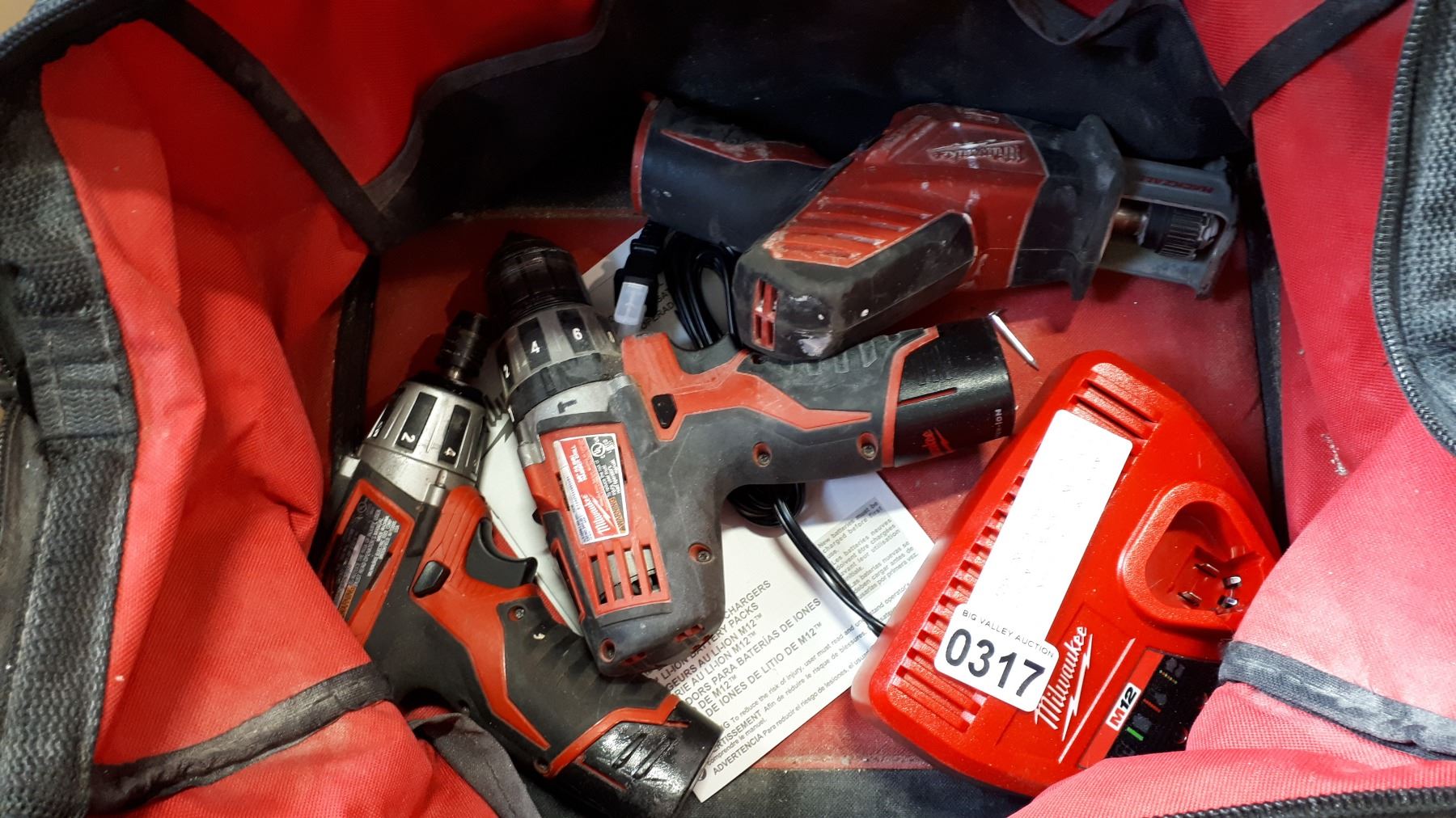 MILWAUKEE M12 DRILL, HEX IMPACT, AND HACKZALL, WITH 2 BATTERIES, CHARGER, AND BAG, ALL WORKING