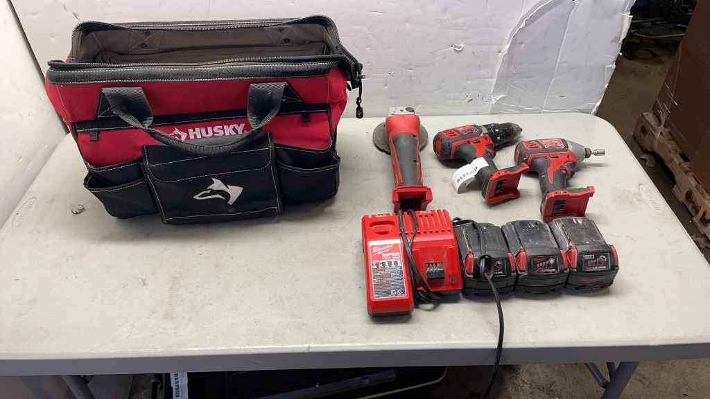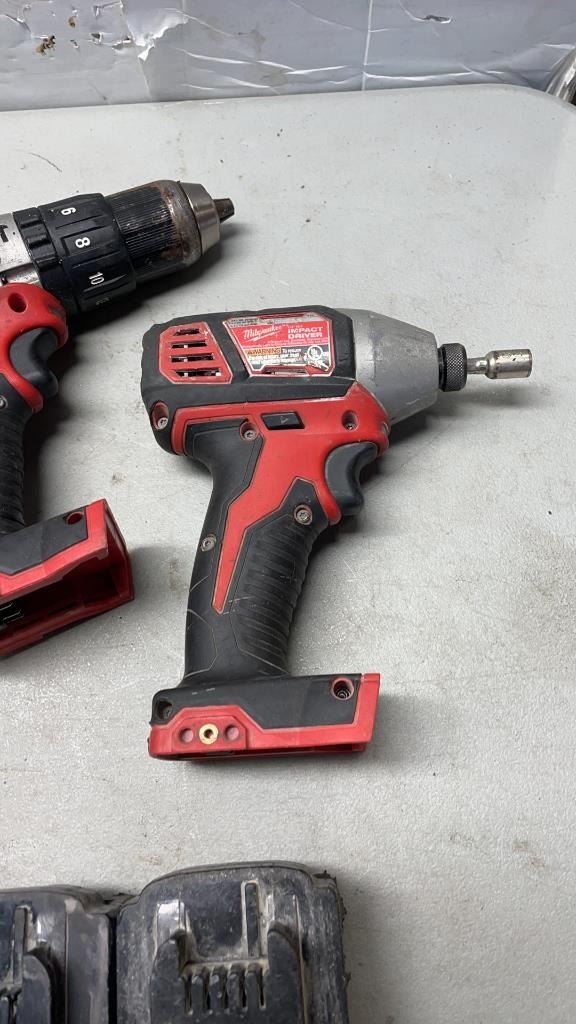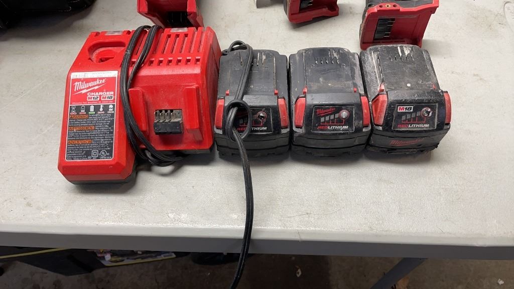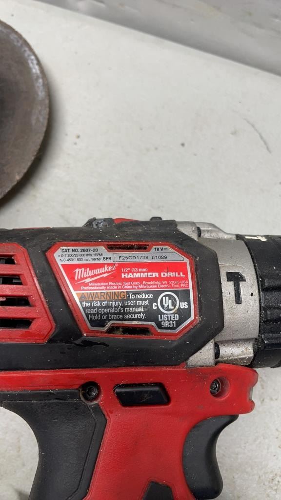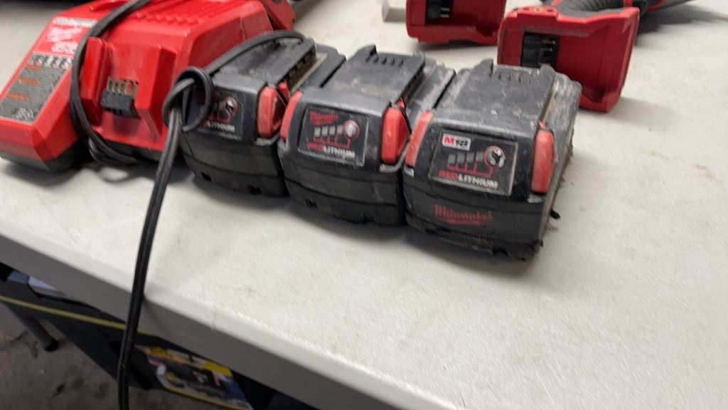 MILWAUKEE M18 CORDLESS TOOL SET, CUT OFF/GRINDER, HAMMER DRILL AND IMPACT DRIVER, XC5.0, XC4.0 AND XC BATTERIES AND CHARGER - TESTED WORKING