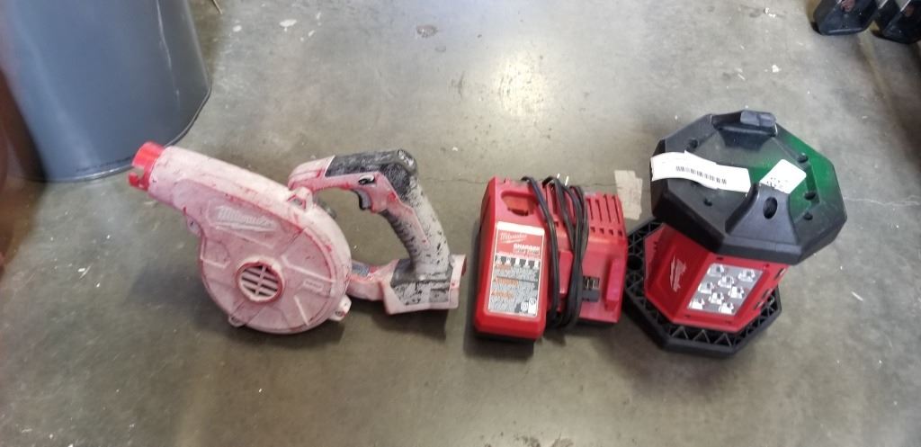 MILWAUKEE M18 FLOODLIGHT AND M18 BLOWER, NO ATTACHMENTS, BOTH WORKING, WITH RAPID CHARGER