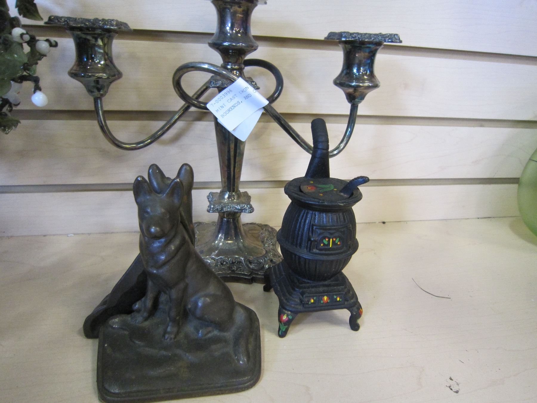 MINI CAST IRON STOVE, DOG BOOKENDS, AND CANDELABRA