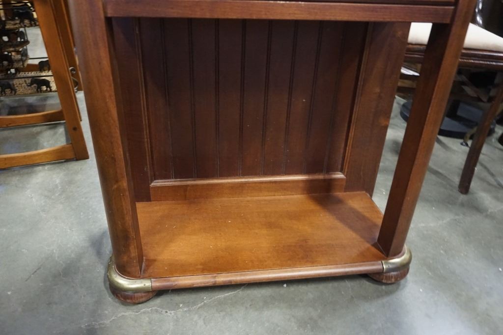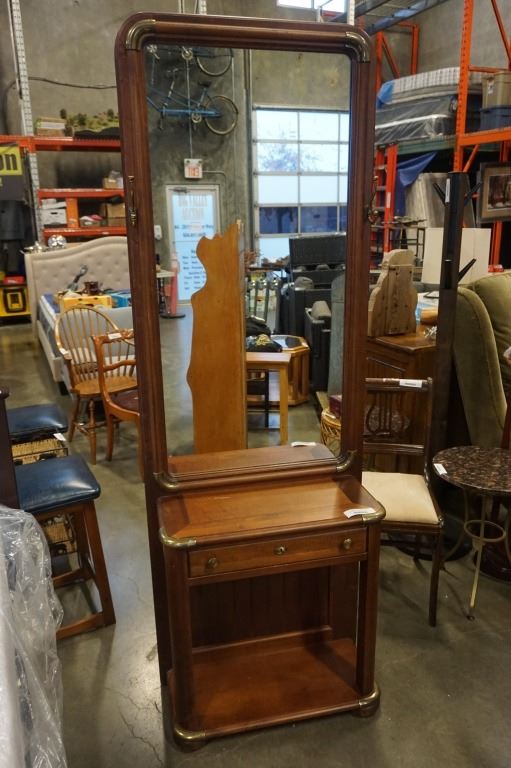 MIRRORED HALL STAND, WOOD WITH BRASS ACCENTS