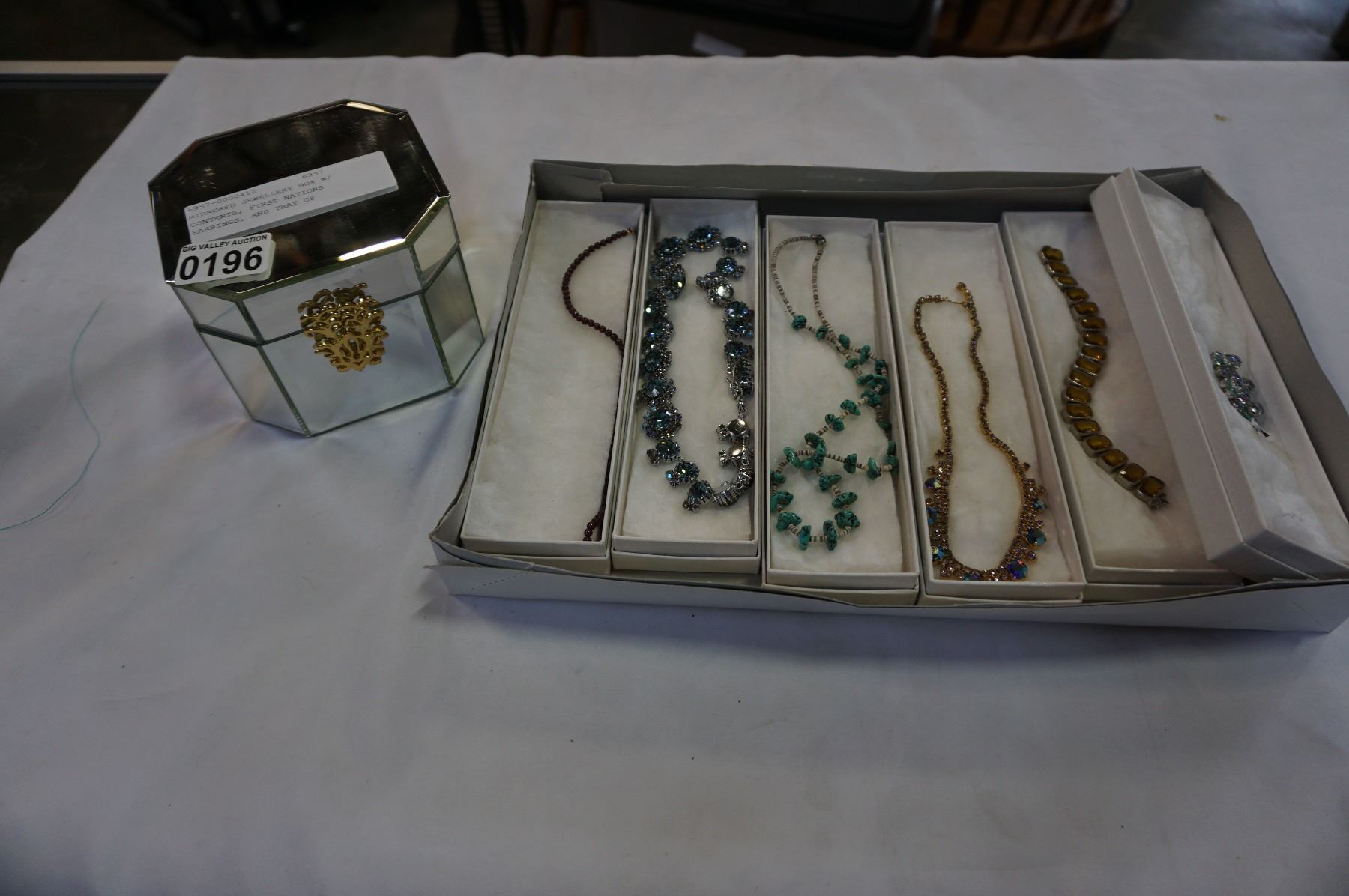 MIRRORED JEWELLERY BOX W/ CONTENTS, FIRST NATIONS EARRINGS, AND TRAY OF NECKLACES
