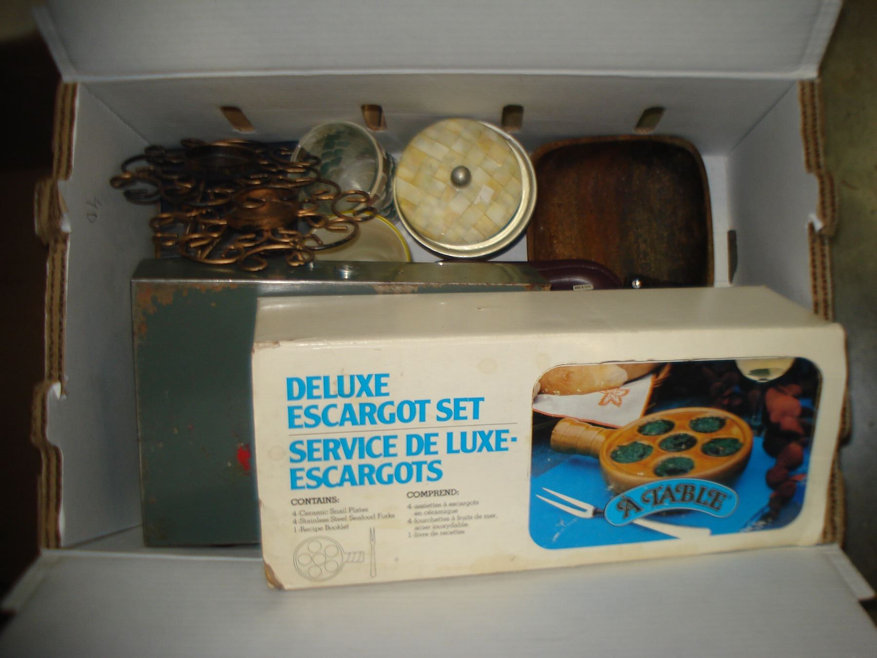 MISC BOX OF HOUSEHOLD ITEMS W/ GREEN METAL BOX
