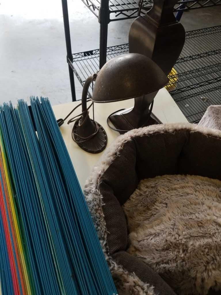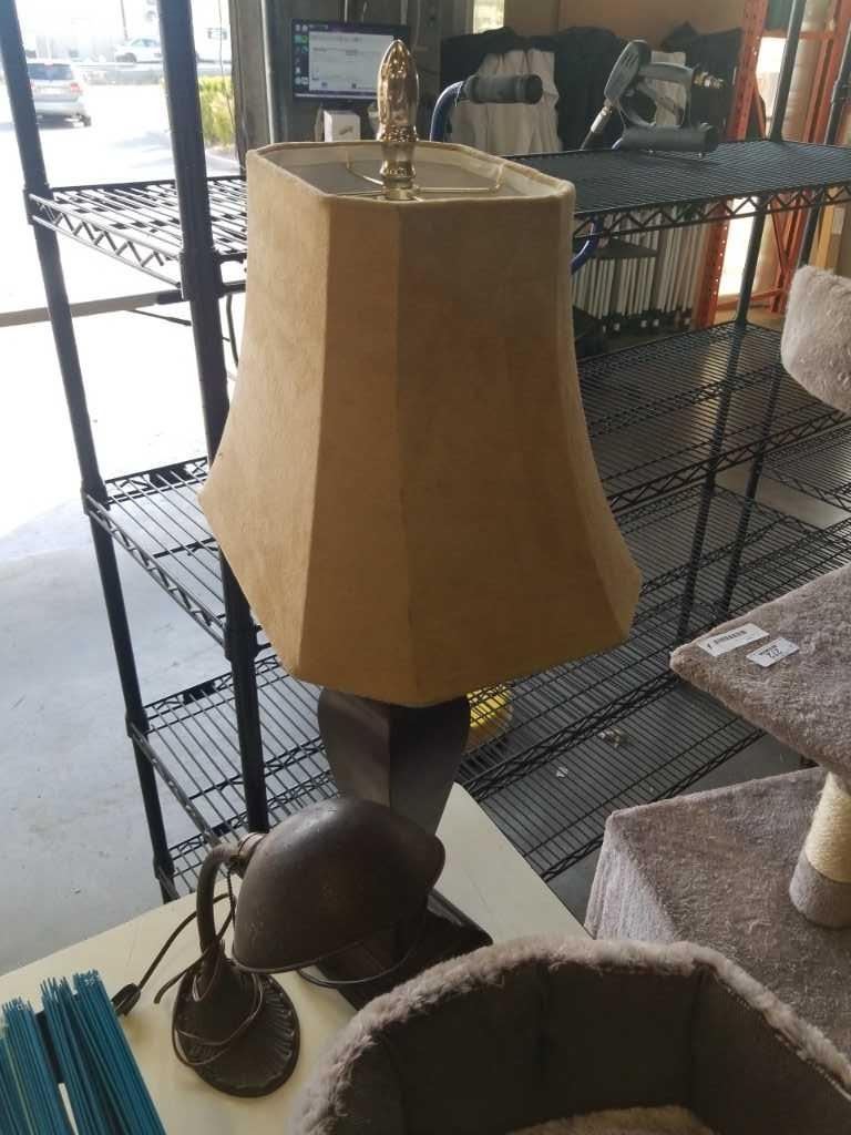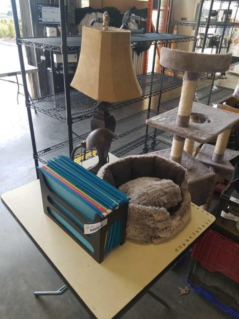 MODERN AND VINTAGE TABLE LAMPS, CAT BED AND RACK