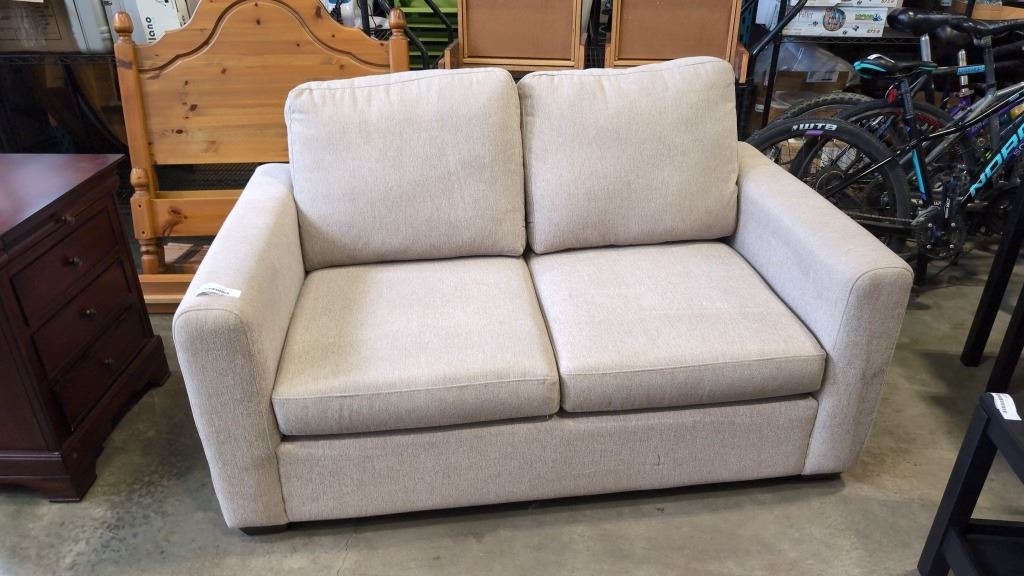 MODERN BEIGE UPHOLSTERED LOVESEAT, MADE IN CANADA, GOOD CLEAN CONDITION