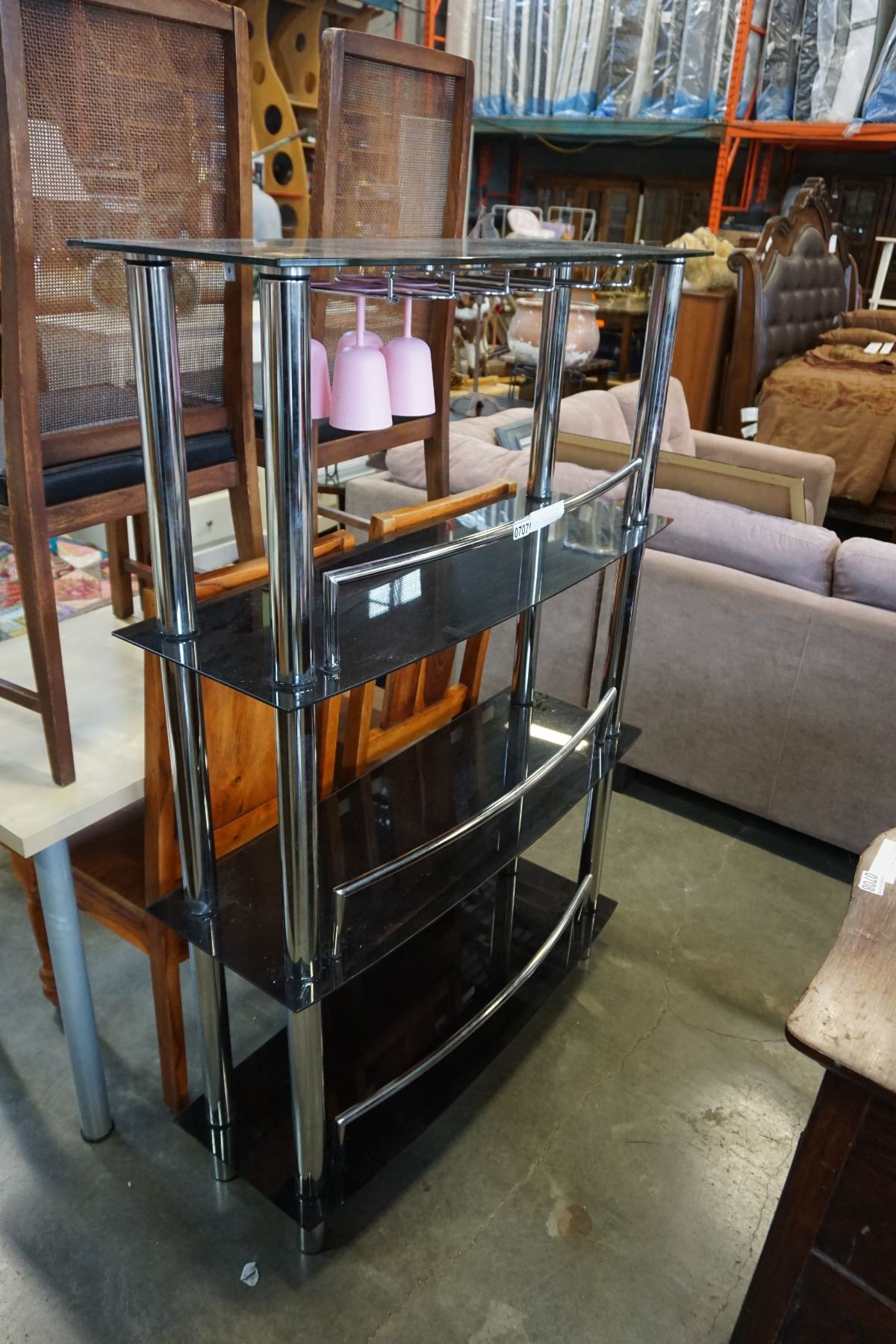 MODERN CHROME AND BLACK GLASS BAR SHELF UNIT WITH CUP RACK