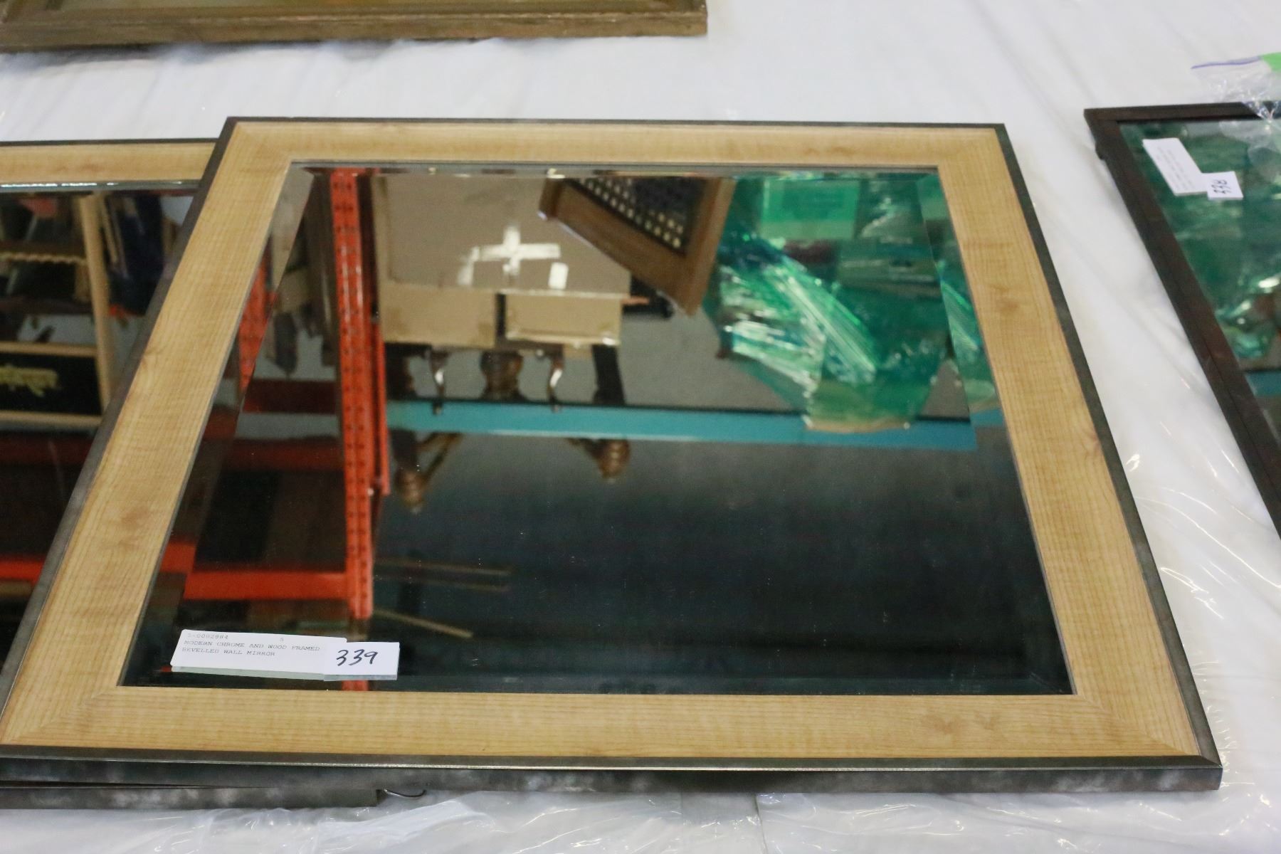 MODERN CHROME AND WOOD FRAMED BEVELLED WALL MIRROR