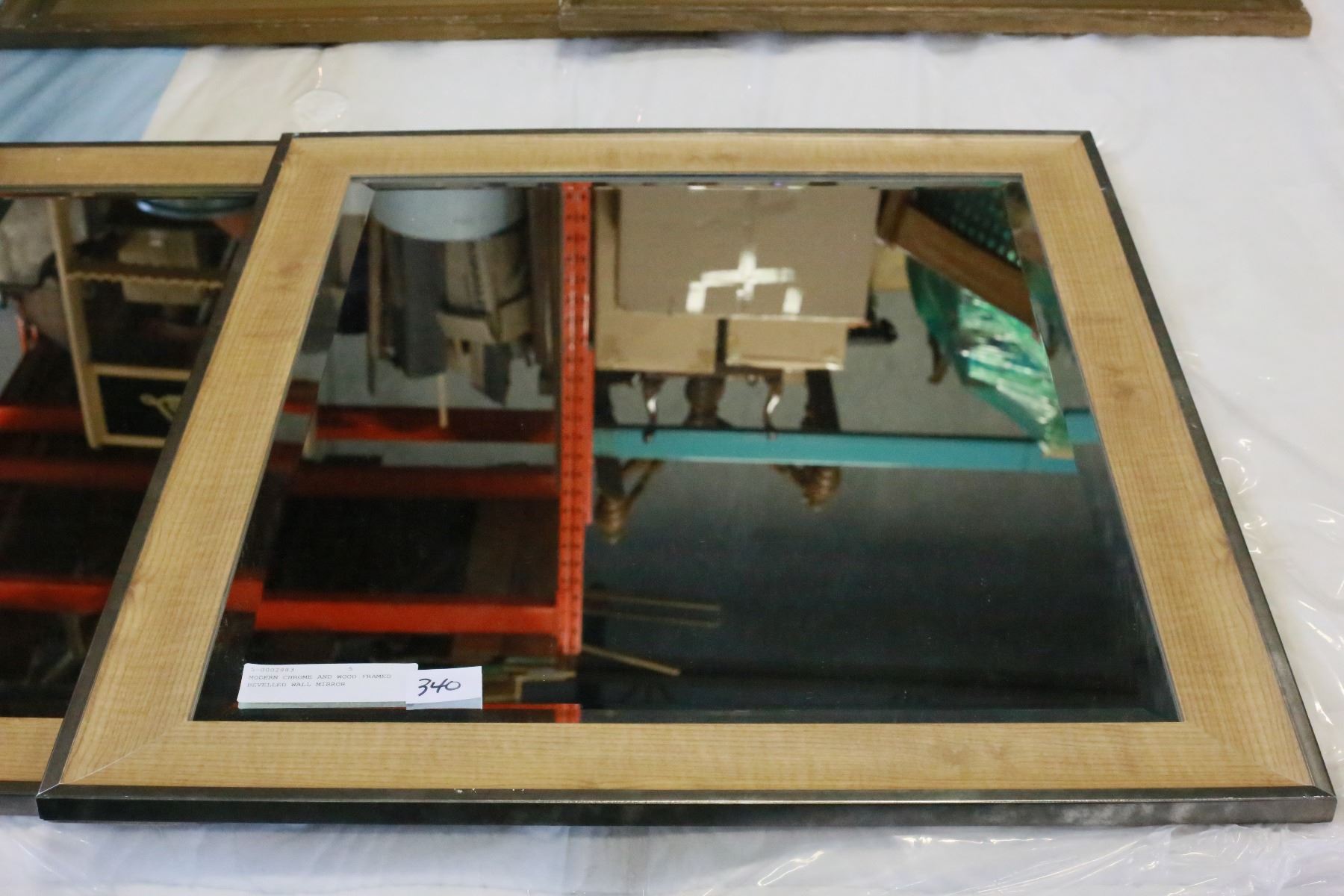 MODERN CHROME AND WOOD FRAMED BEVELLED WALL MIRROR